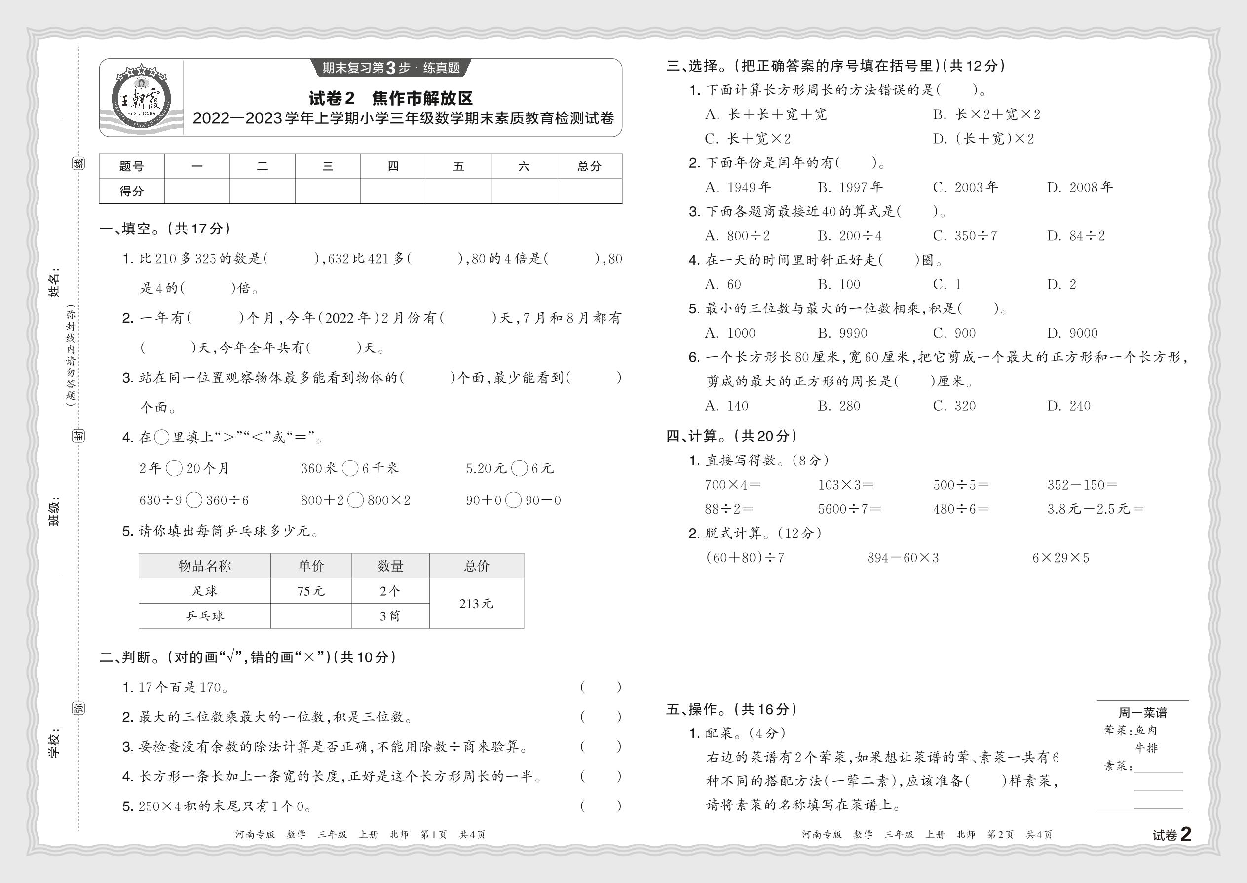 河南省焦作市解放区2022-2023学年上学期小学三年级数学期末素质教育检测试卷(北师版)【2】