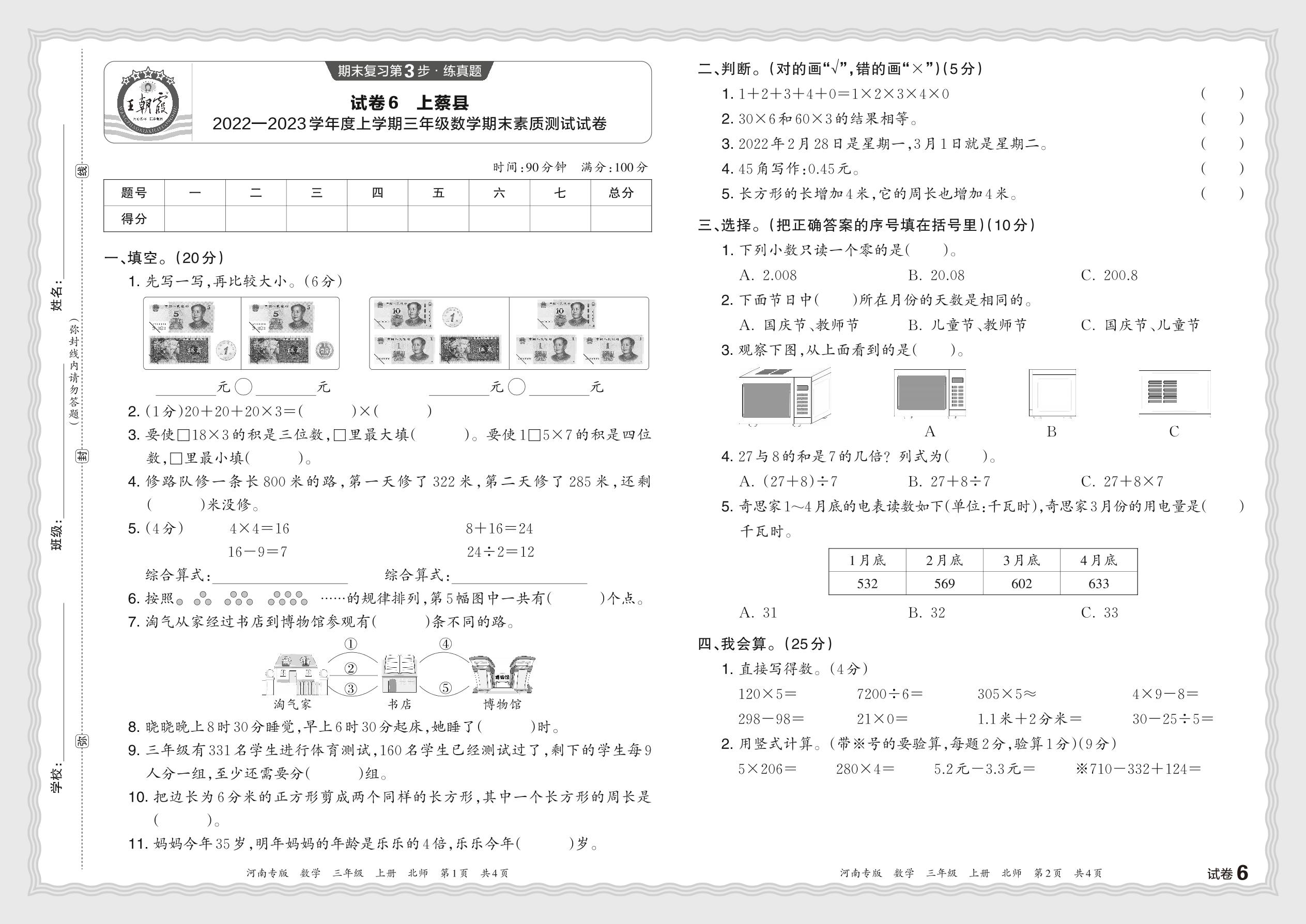 河南省驻马店市上蔡县2022—2023学年度上学期三年级数学期末素质测试试卷(北师版)【6】
