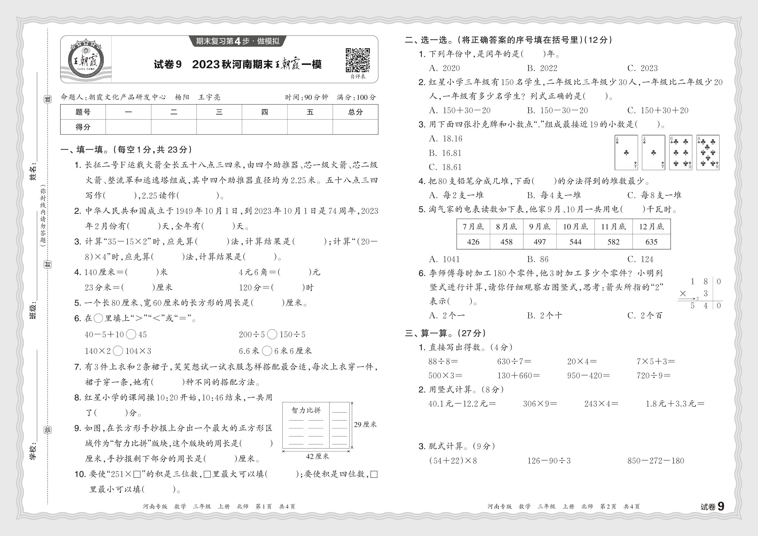 2023秋上册三年级数学北师版 河南期末王朝霞一模【9】