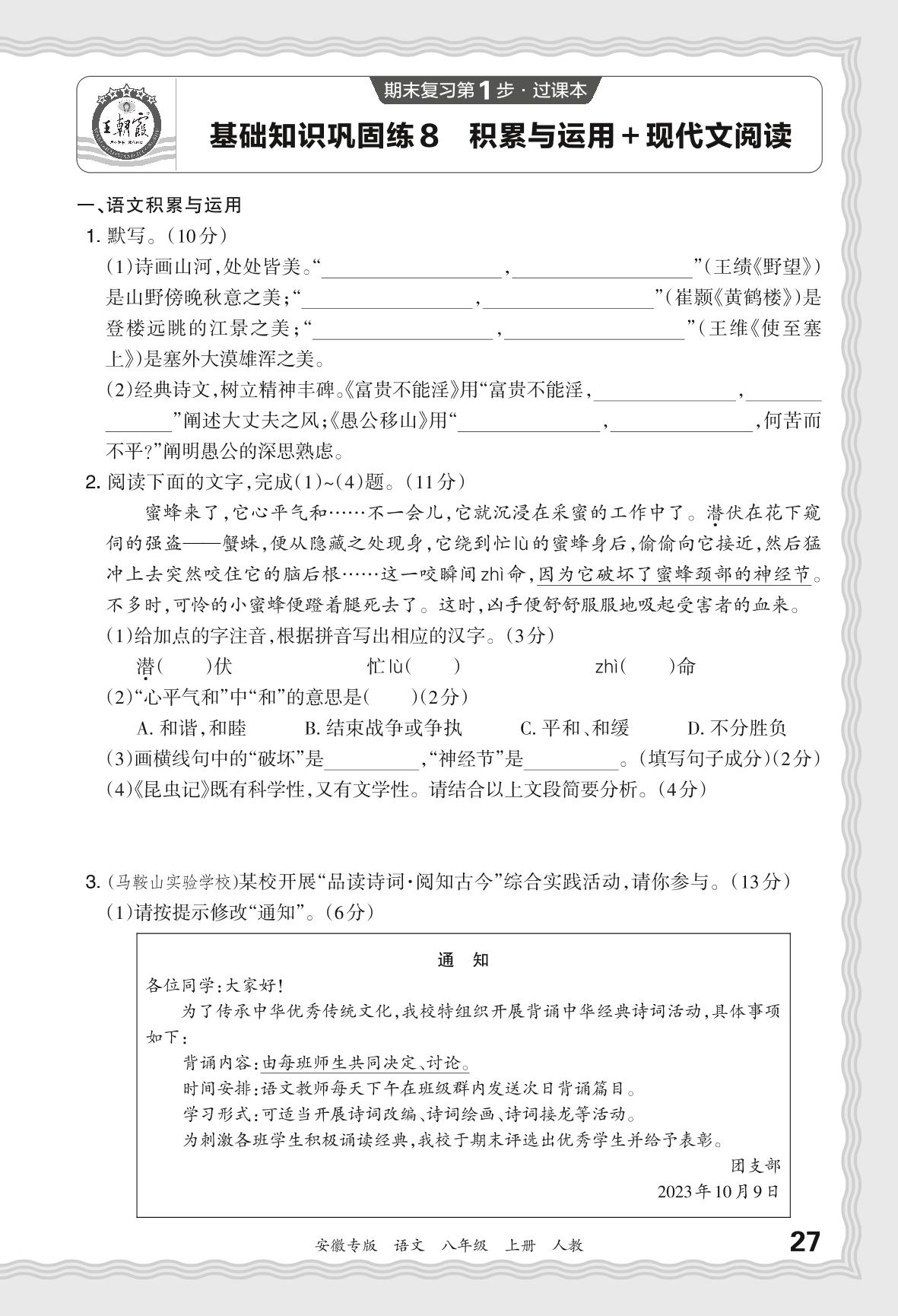 2023秋上册八年级语文人教版 期末过课本·基础知识巩固练 积累与运用+现代文阅读【8】