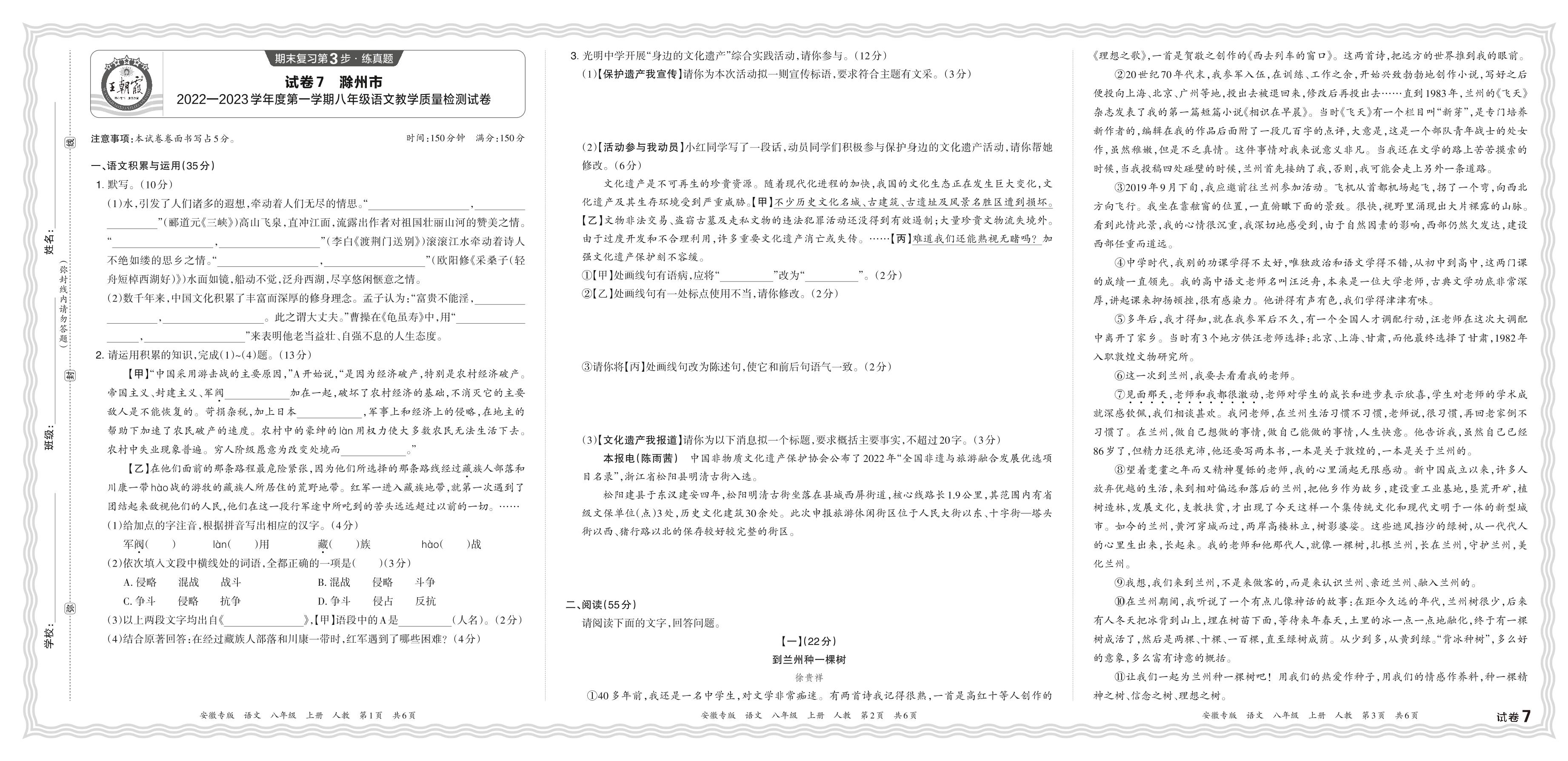 安徽省滁州市2022—2023学年度第一学期八年级语文教学质量检测试卷(人教版)【7】