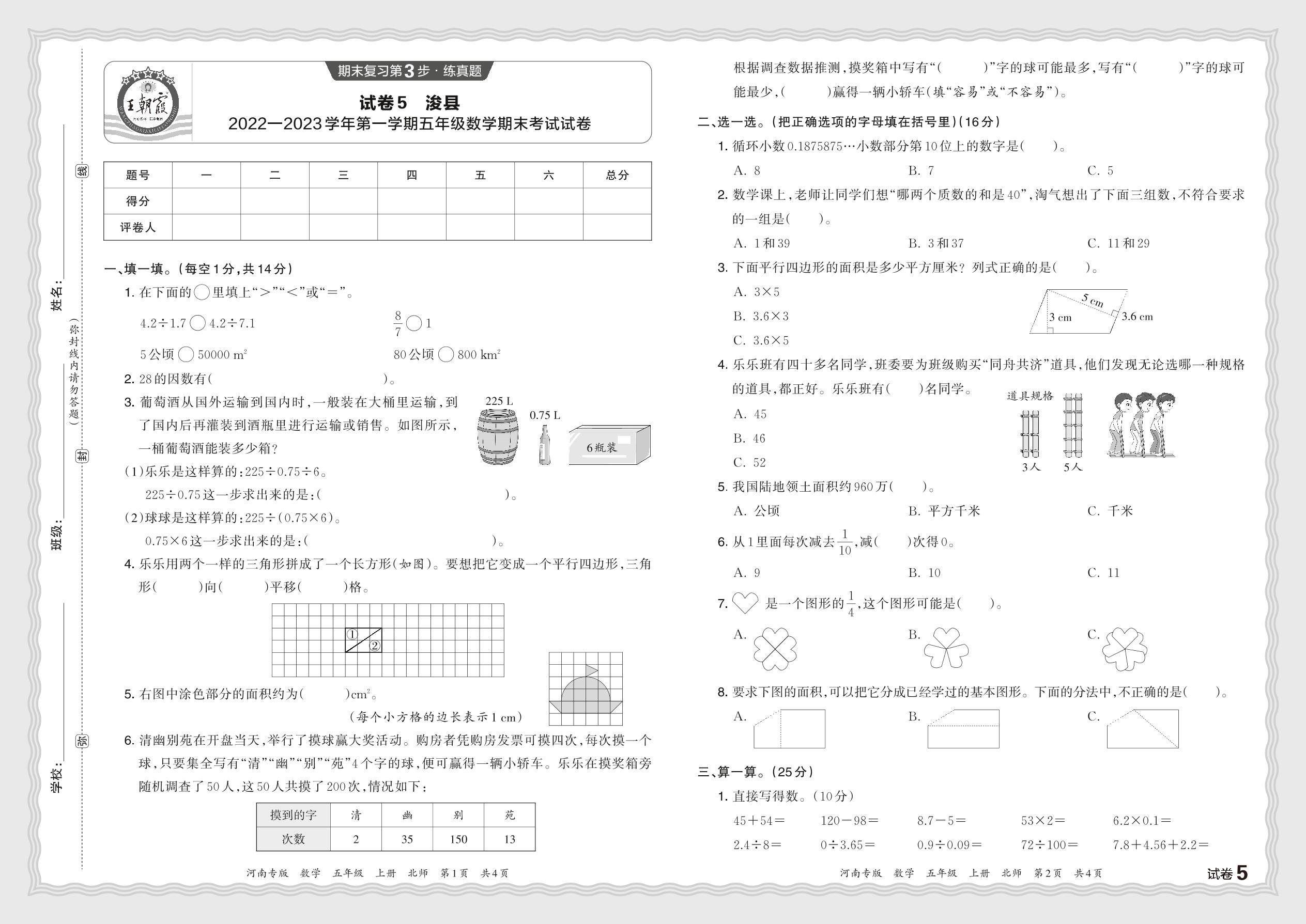 河南省鹤壁市浚县2022—2023学年上学期五年级数学教学质量调研测试(北师版)【5】