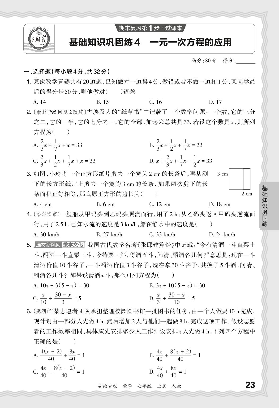 2023秋上册七年级数学人教版 期末过课本·基础知识巩固练 一元一次方程的应用【4】