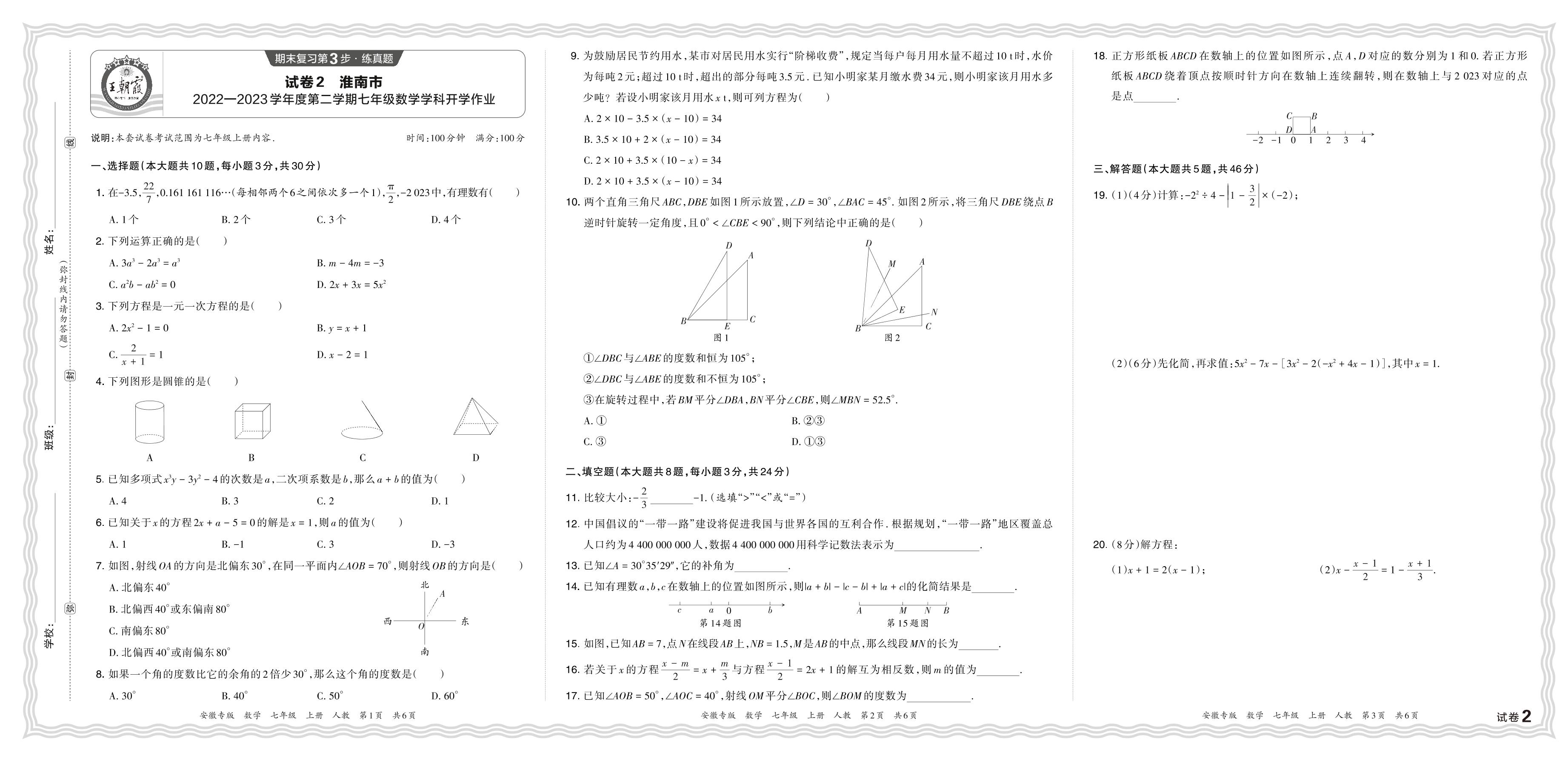 安徽省淮南市2022—2023学年度第二学期七年级数学学科开学作业(人教版)【2】