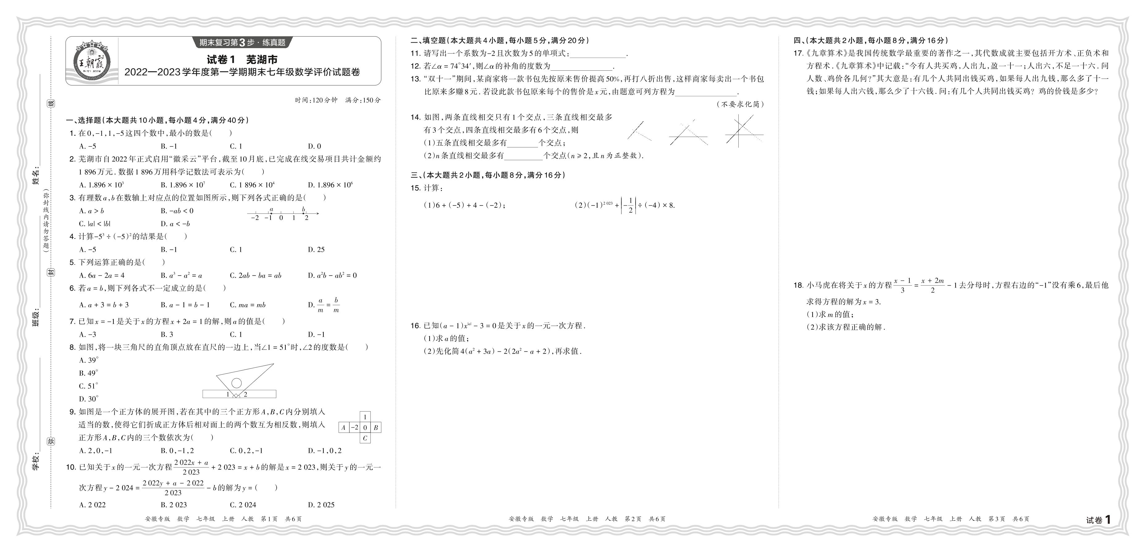 安徽省芜湖市2022—2023学年度第一学期期末七年级数学评价试题卷(人教版)【1】