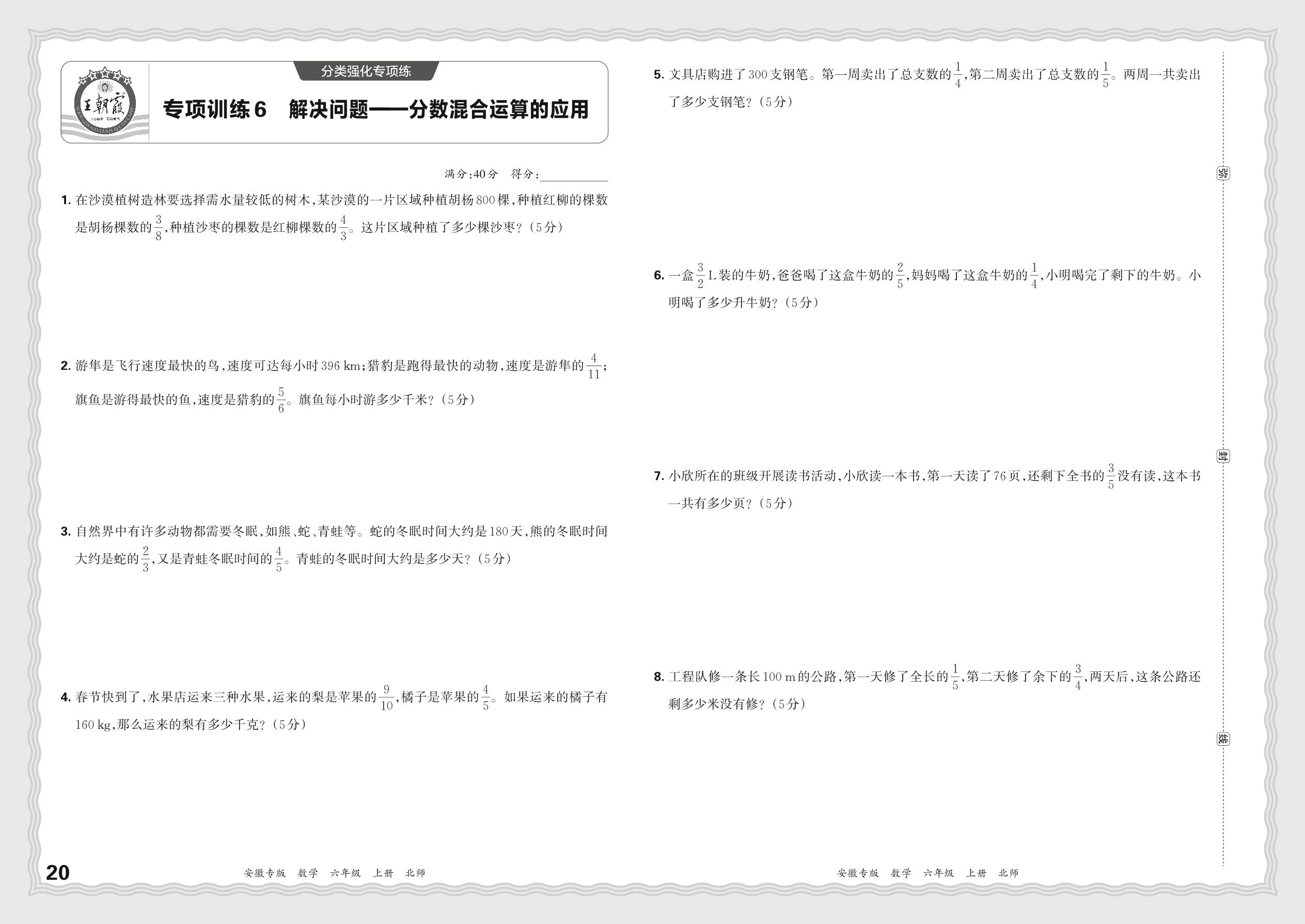 2023秋上册六年级数学北师版 期末专项·解决问题——分数混合运算的应用【6】
