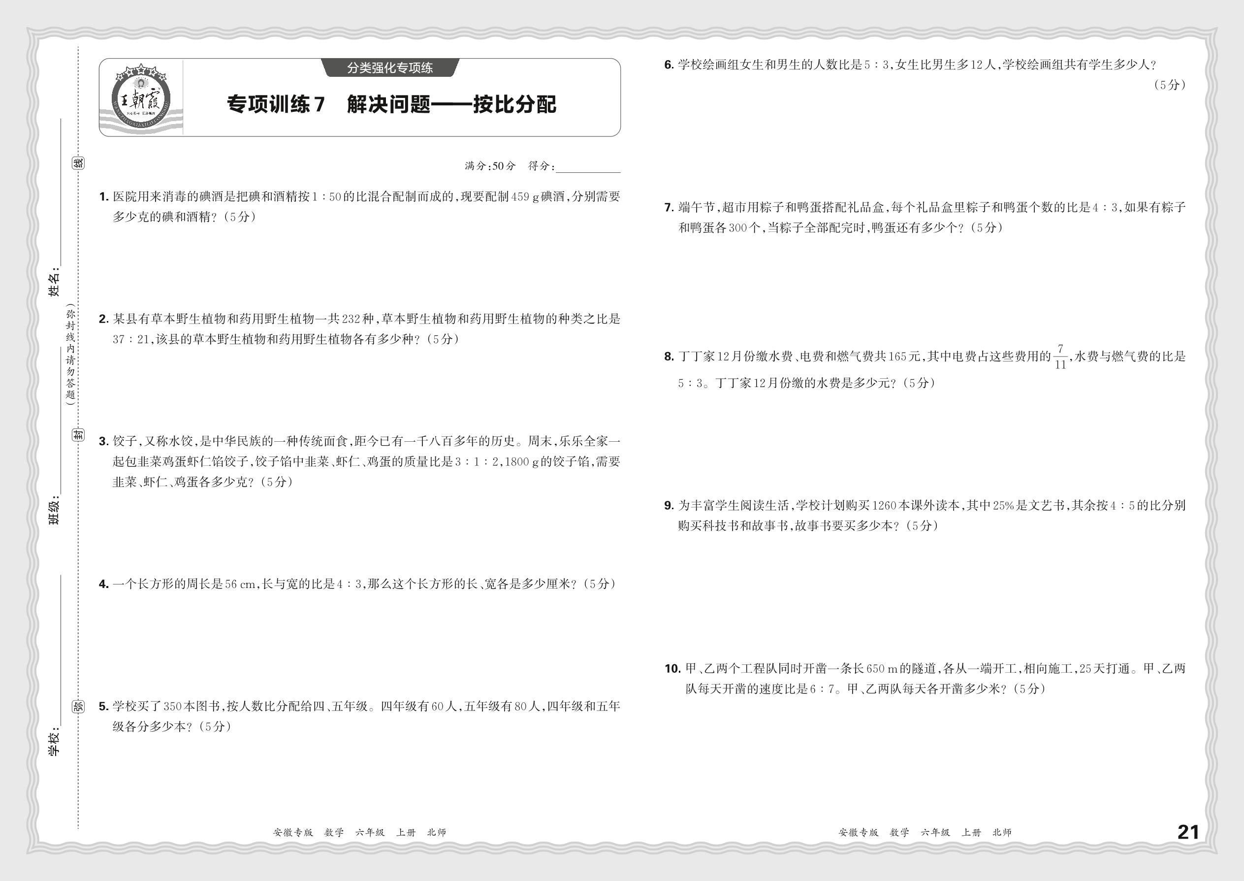 2023秋上册六年级数学北师版 期末专项·解决问题——按比分配【7】