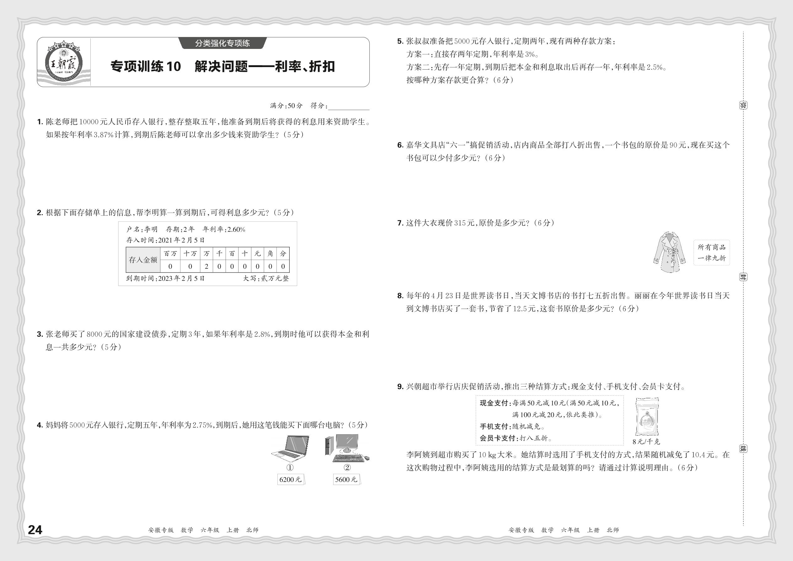 2023秋上册六年级数学北师版 期末专项·解决问题——利率、折扣【10】