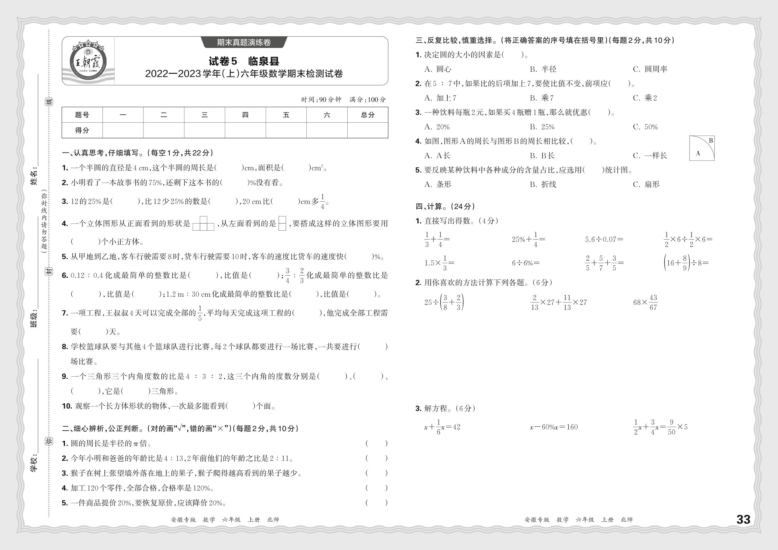 安徽省阜阳市临泉县2022—2023学年(上)六年级数学期末检测试卷(北师版)【5】