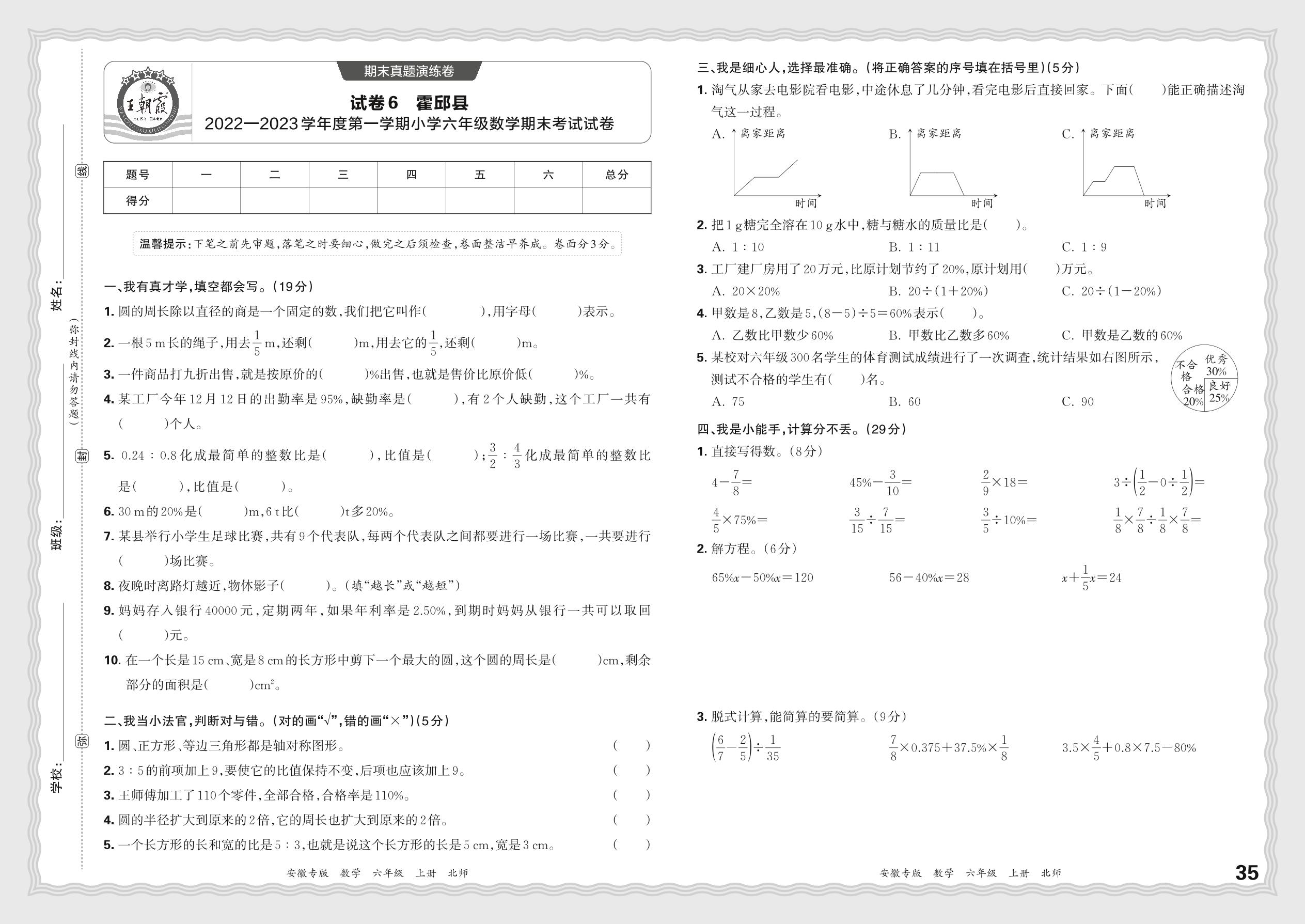 安徽省六安市霍邱县2022—2023学年度第一学期小学六年级数学期末考试试卷(北师版)【6】