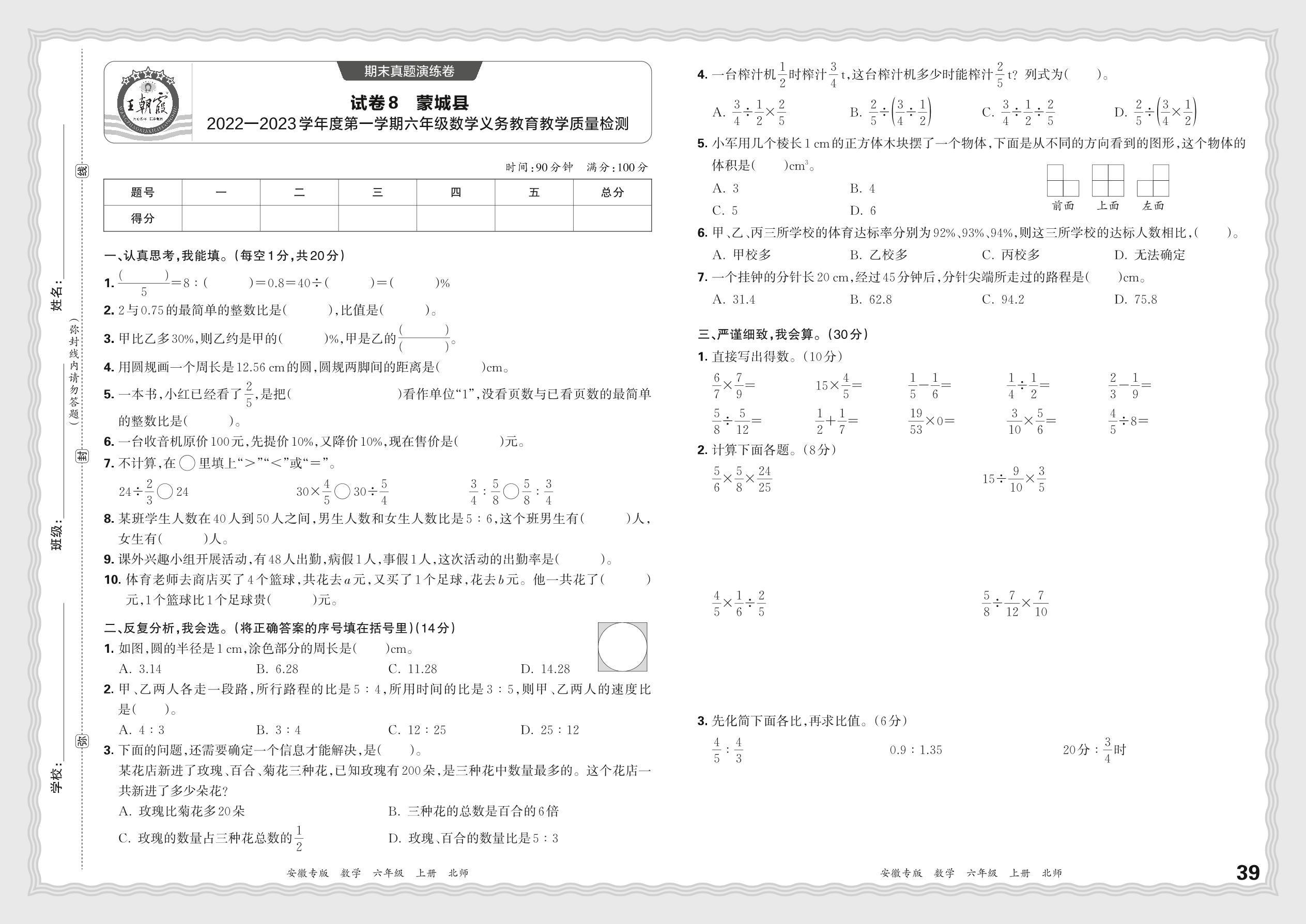 安徽省亳州市蒙城县2022—2023学年度第一学期六年级数学义务教育教学质量检测(北师版)【8】