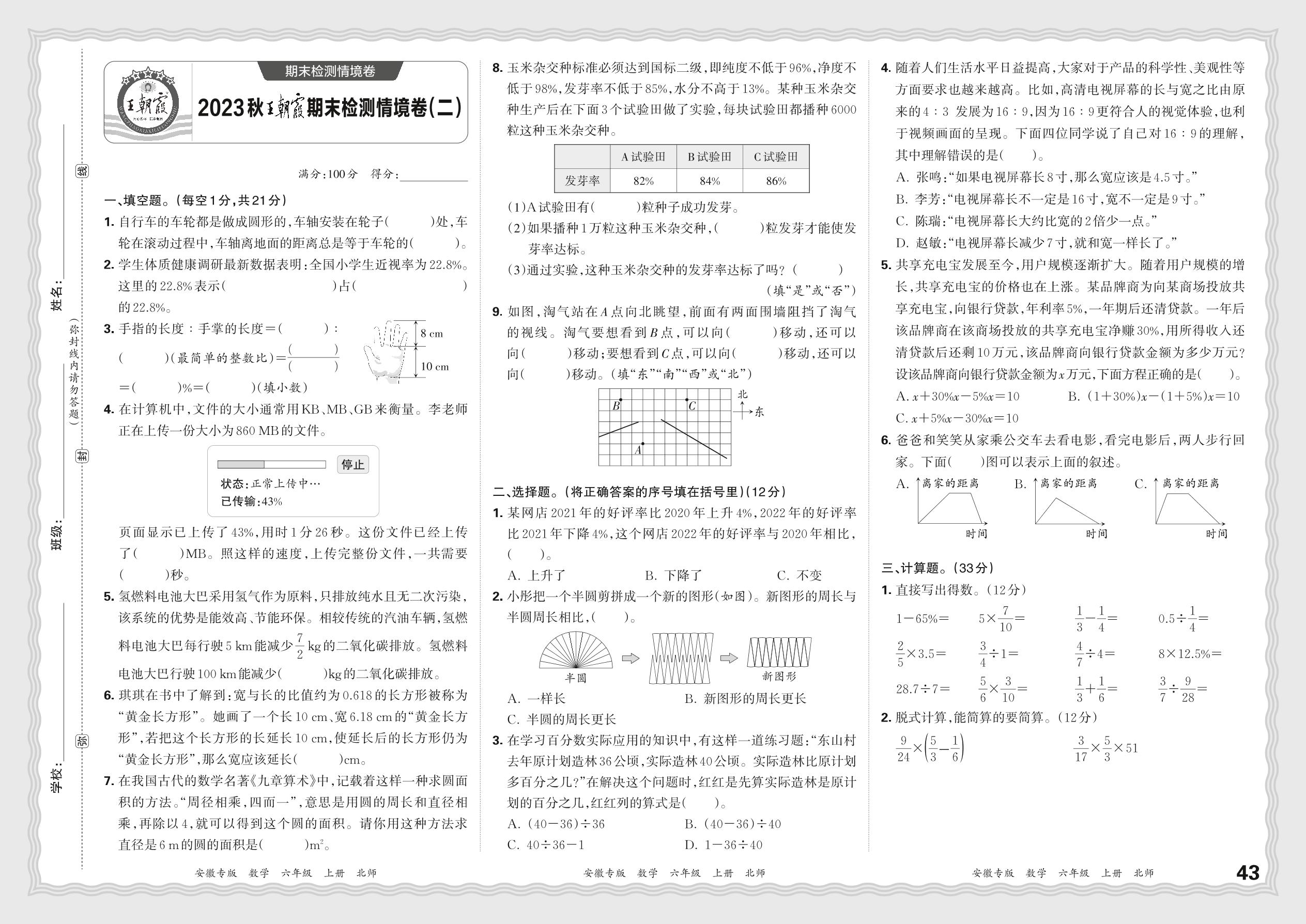 2023秋上册六年级数学北师版 王朝霞期末检测情境卷(二)