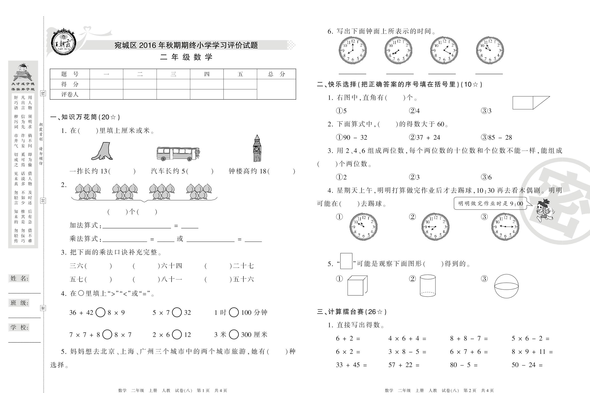 2016-2017学年第一学期南阳市宛城区二年级数学试卷(人教版)【8】