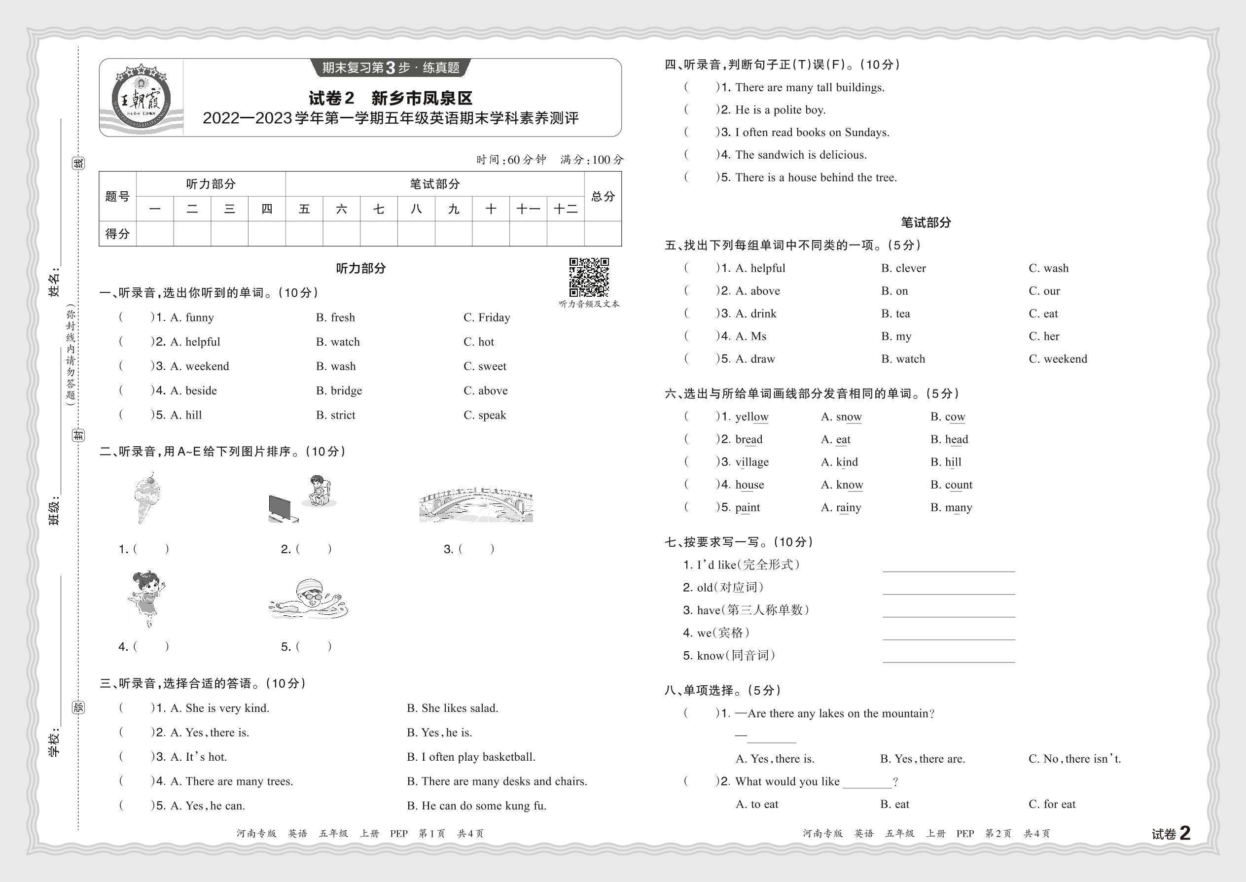 河南省新乡市凤泉区2022—2023学年第一学期五年级英语学科素养测评(人教PEP版)【2】