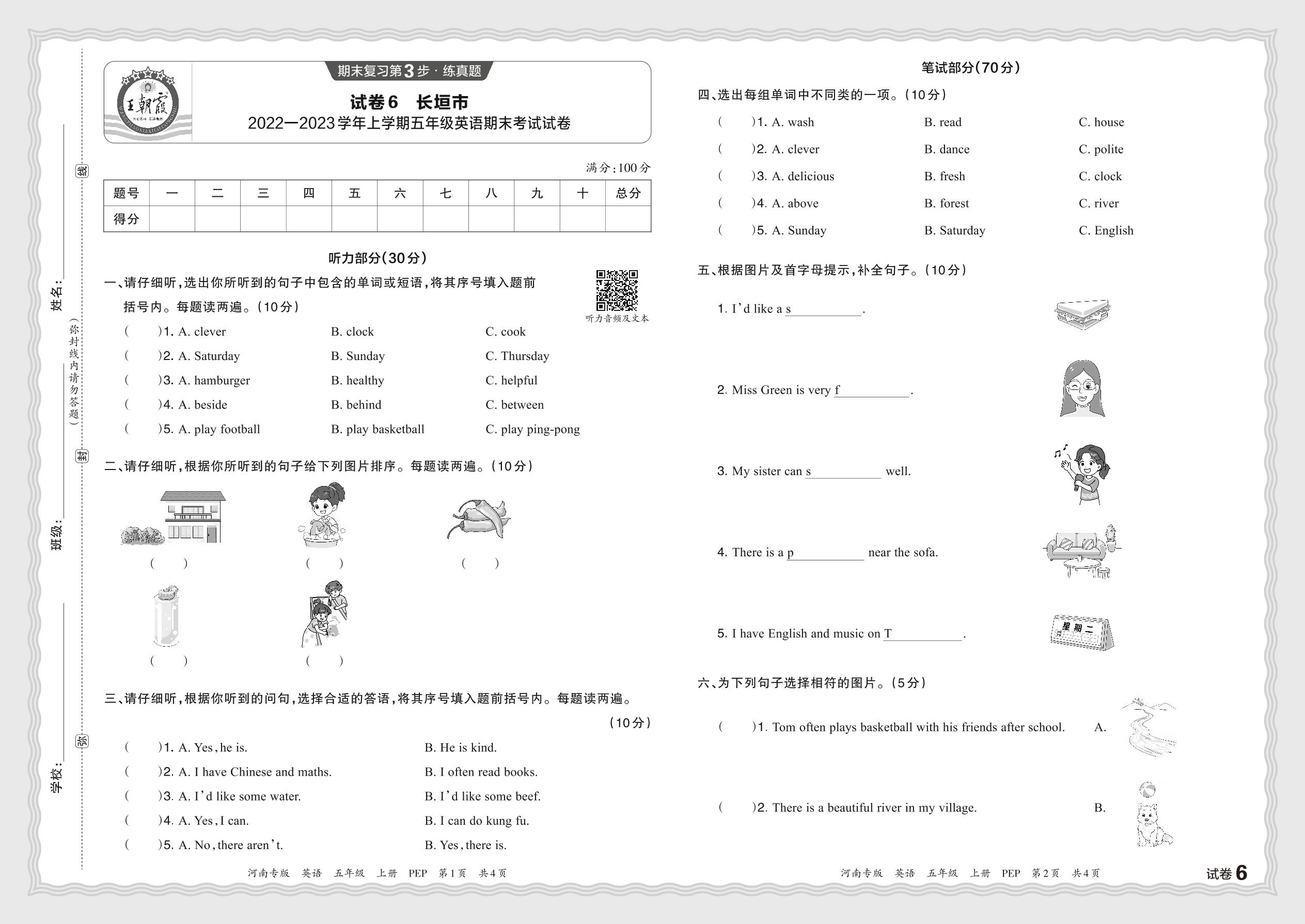 河南省长垣市2022—2023学年上学期五年级英语期末考试试卷(人教PEP版)【6】