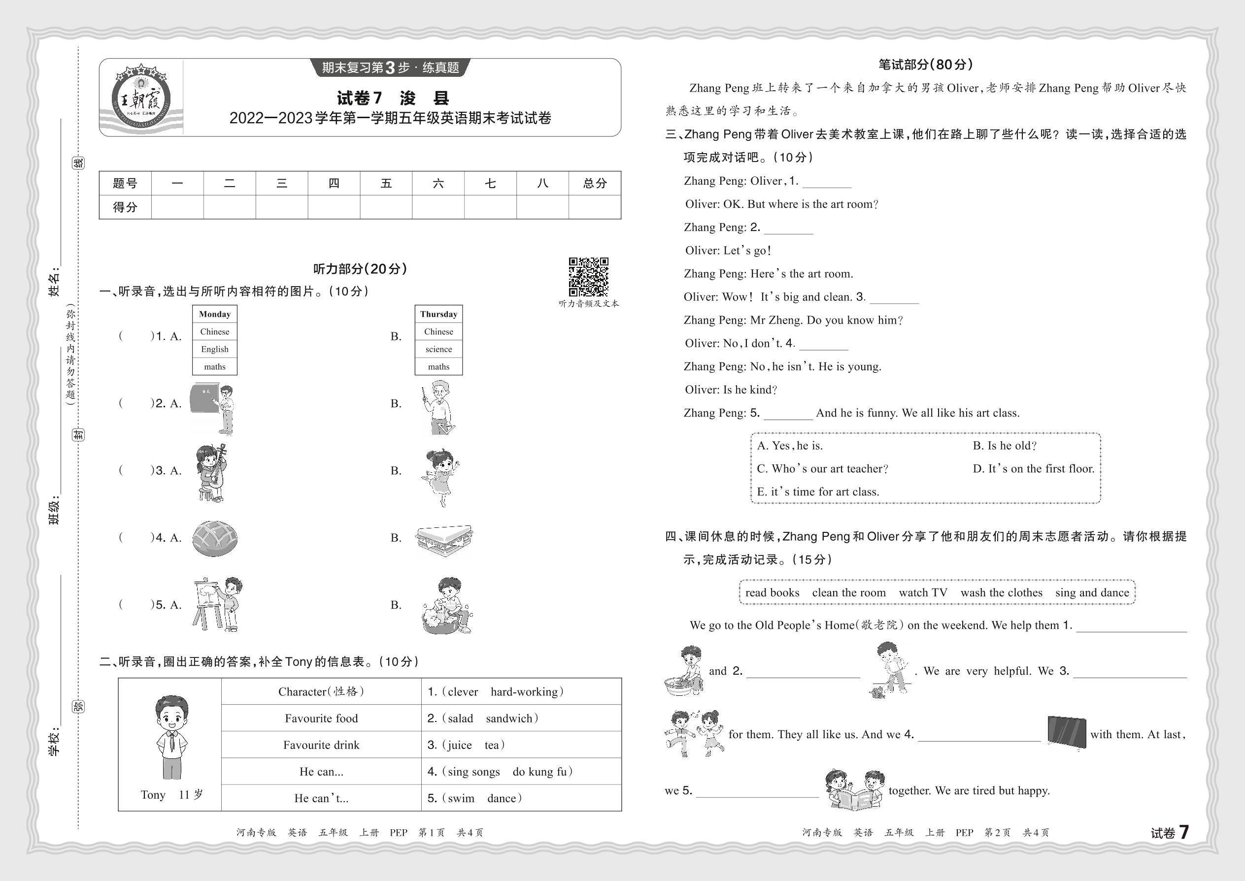 河南省鹤壁市浚县2022—2023学年第一学期五年级期末试卷(人教PEP版)【7】