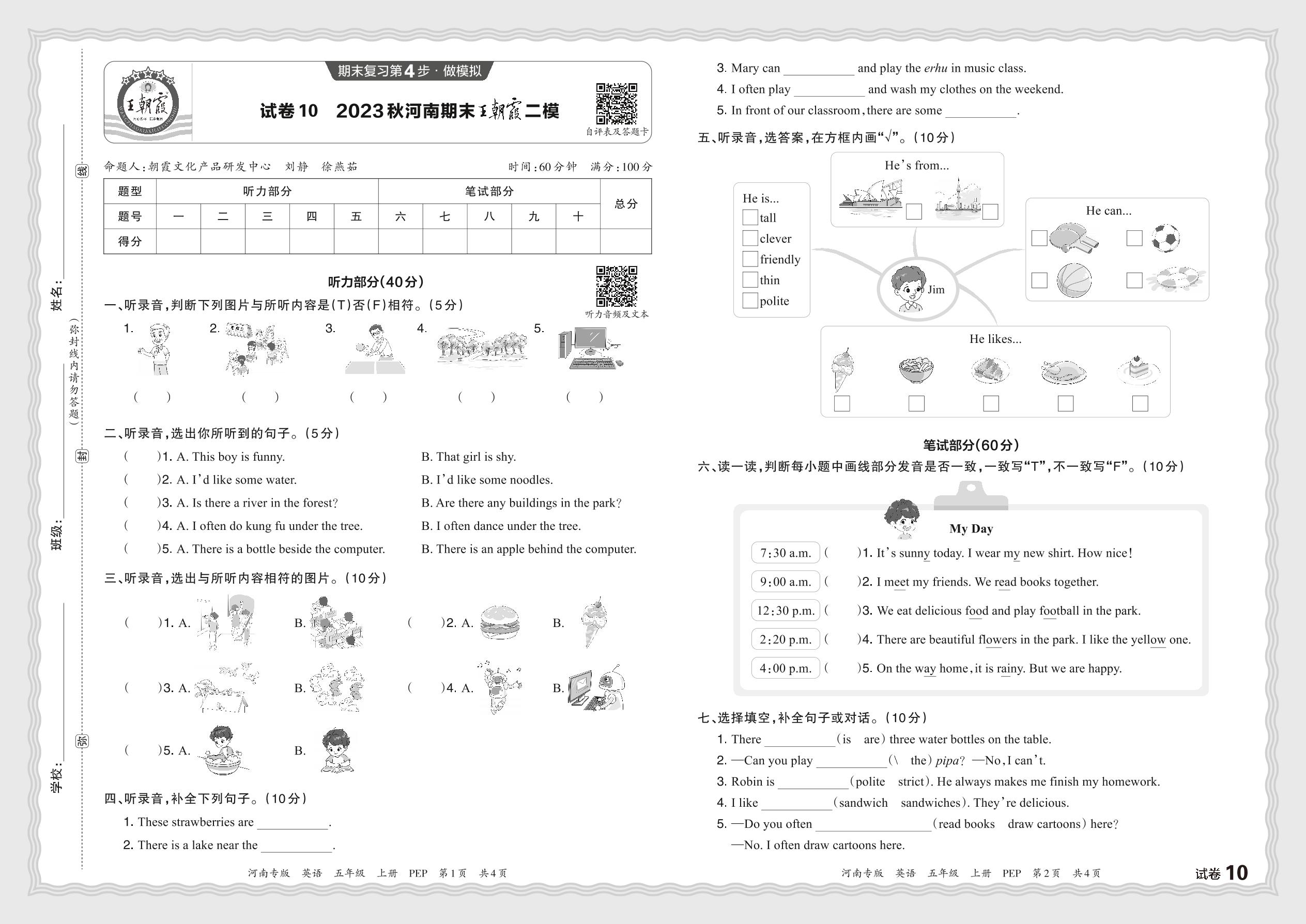 2023秋上册五年级英语人教PEP版 河南期末王朝霞二模【10】