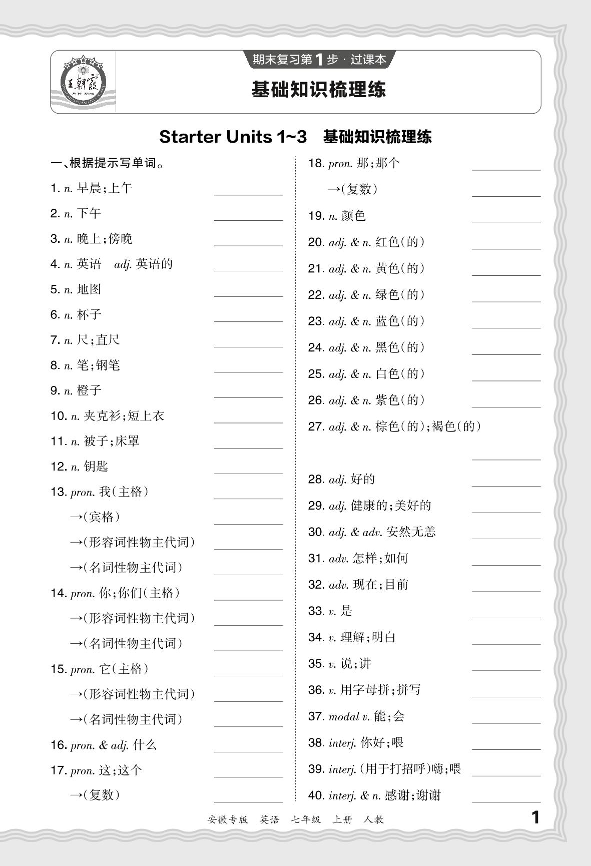 2023秋上册七年级英语人教版 期末过课本·Starter Units 1~3 基础知识梳理练