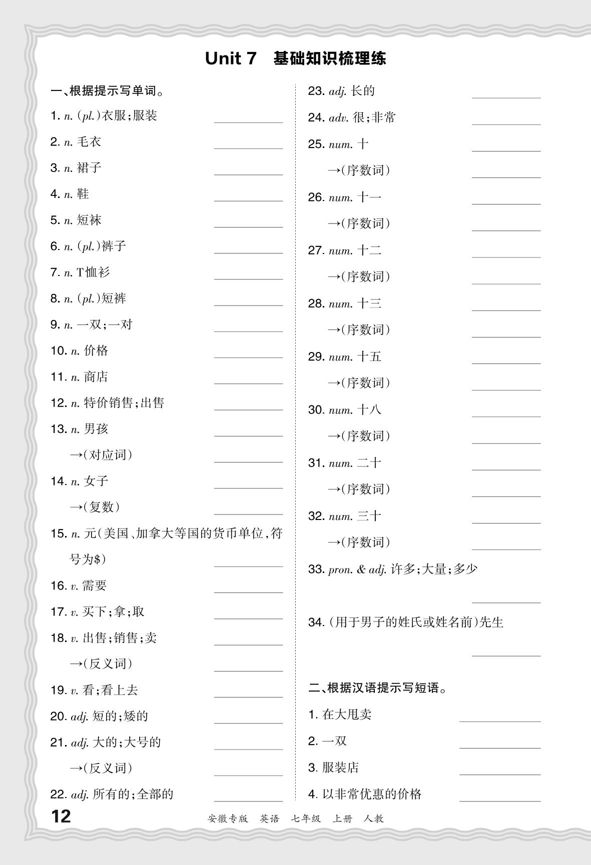 2023秋上册七年级英语人教版 期末过课本·Unit 7 基础知识梳理练
