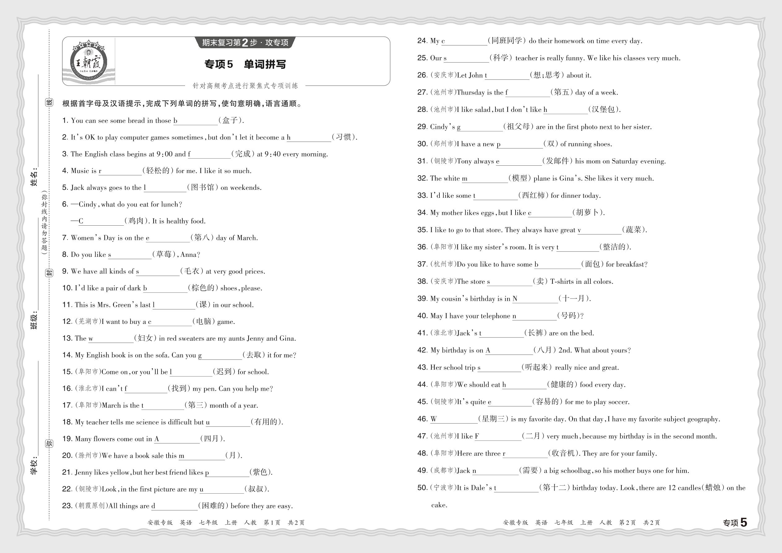 2023秋上册七年级英语人教版 期末专项卷·单词拼写【5】
