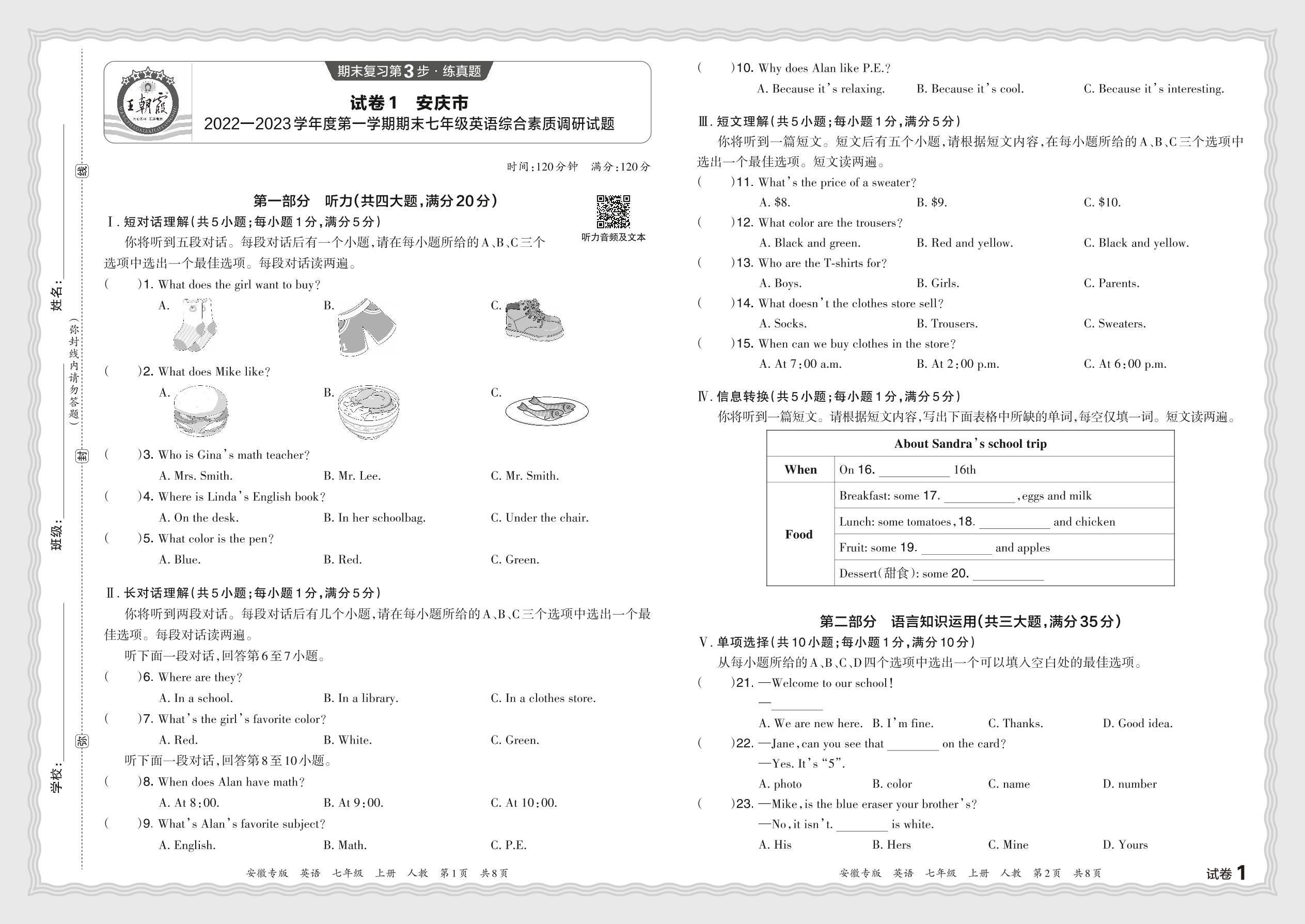 安徽省安庆市2022—2023学年度第一学期期末七年级英语综合素质调研试题(人教版)【1】