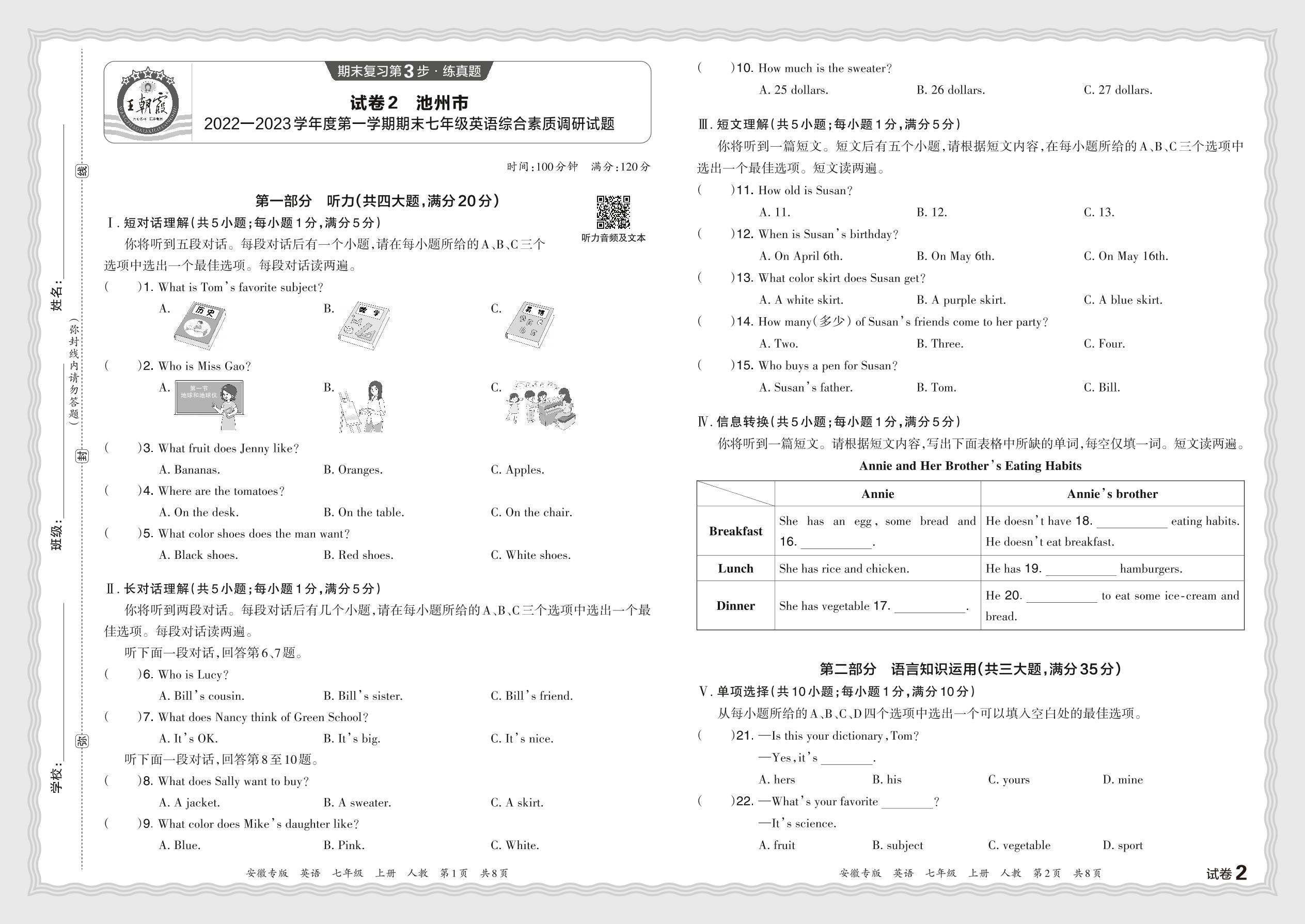 安徽省池州市2022—2023学年度第一学期期末七年级英语综合素质调研试题(人教版)【2】