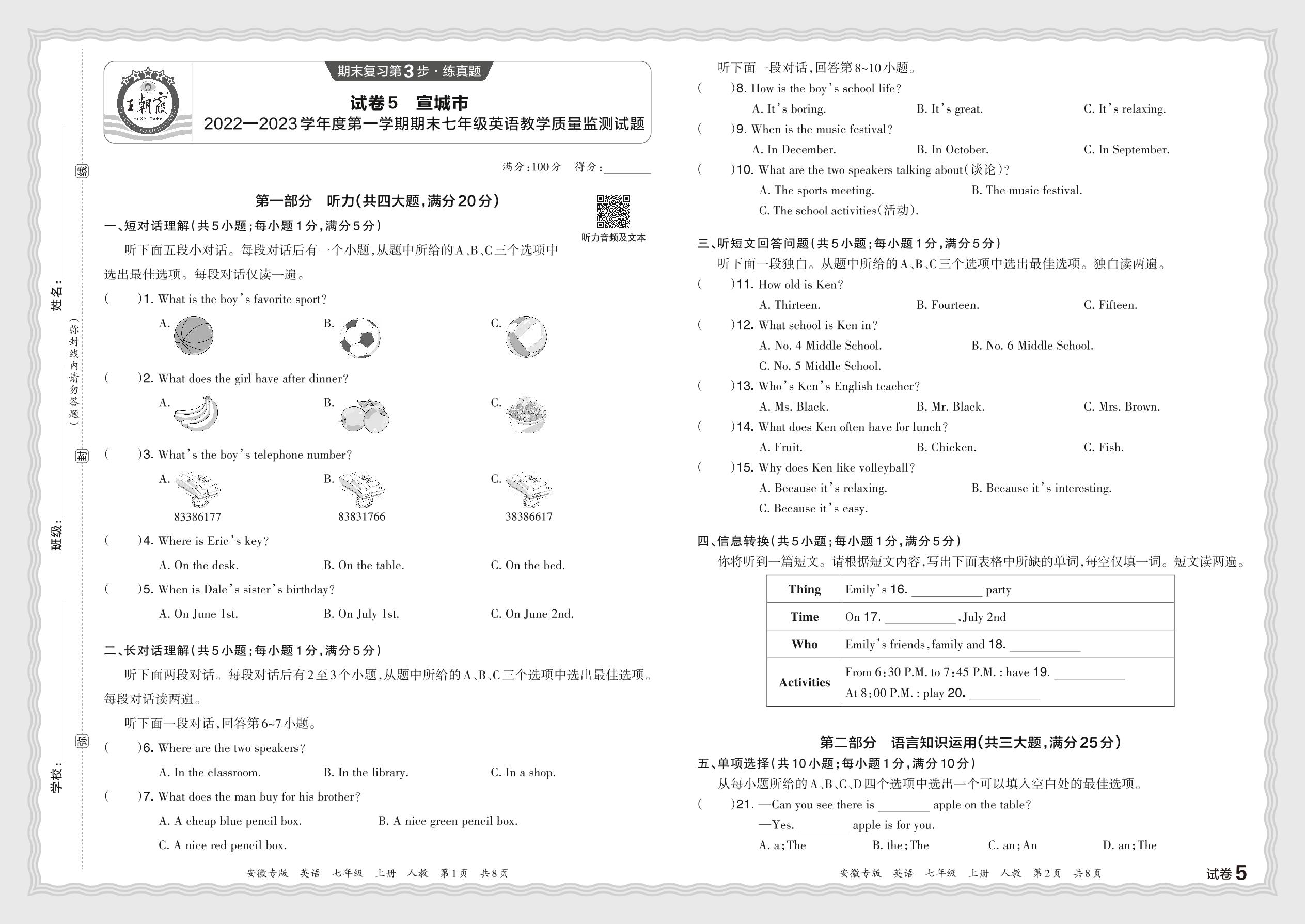 安徽省宣城市2022—2023学年度第一学期期末七年级英语教学质量监测试题(人教版)【5】