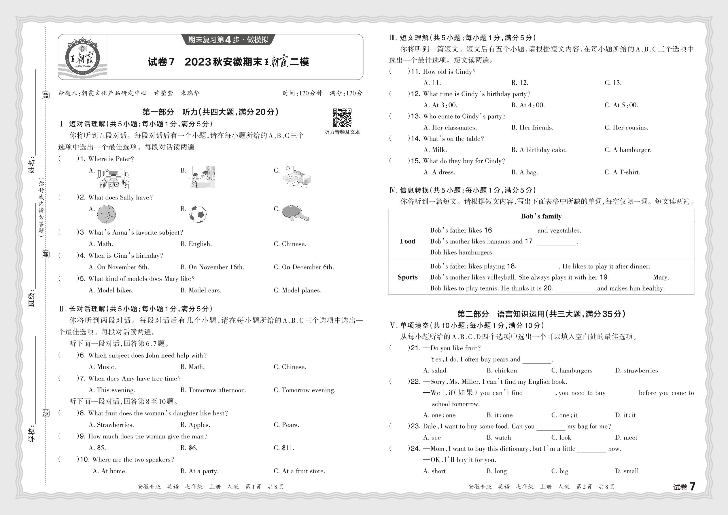 2023秋上册七年级英语人教版 安徽期末王朝霞二模