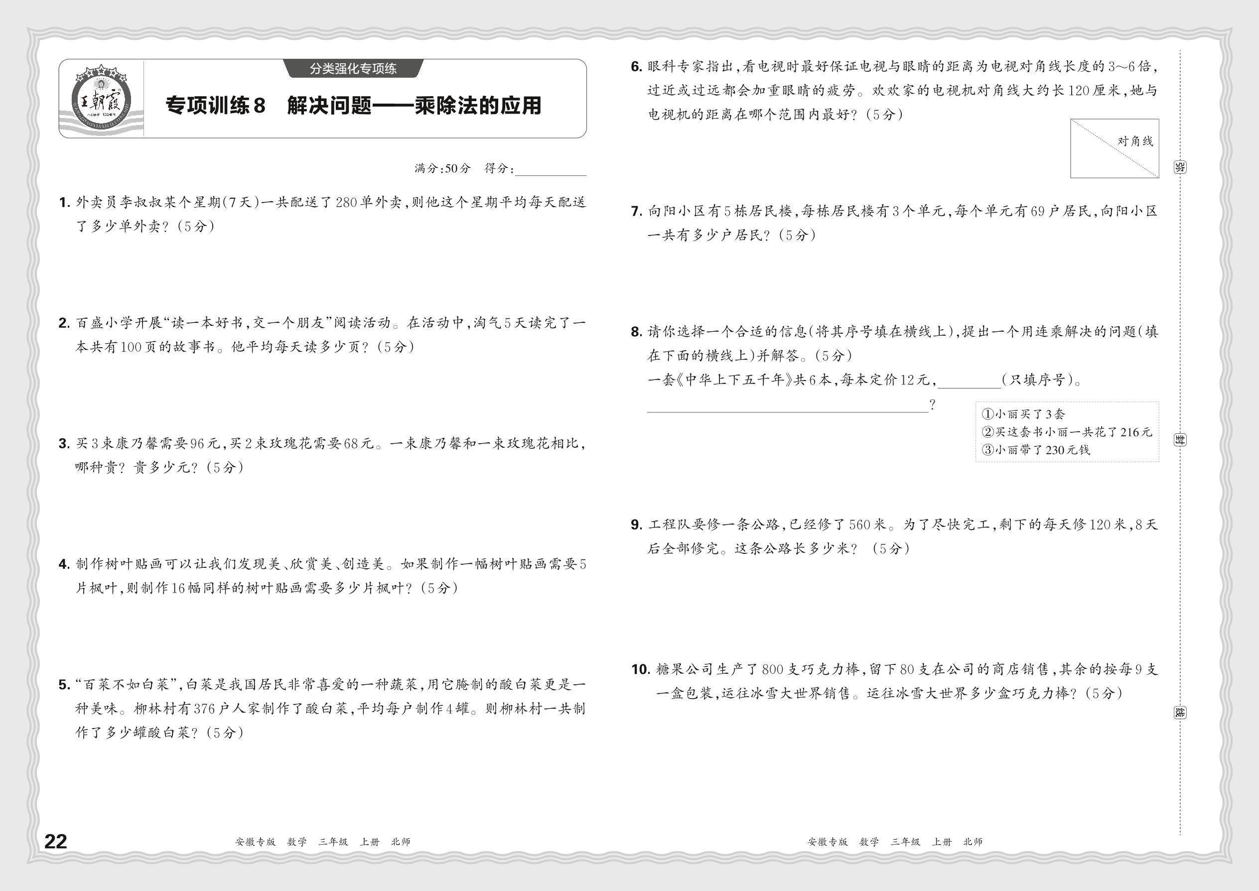 2023秋上册三年级数学北师版 期末专项·解决问题——乘除法的应用【8】