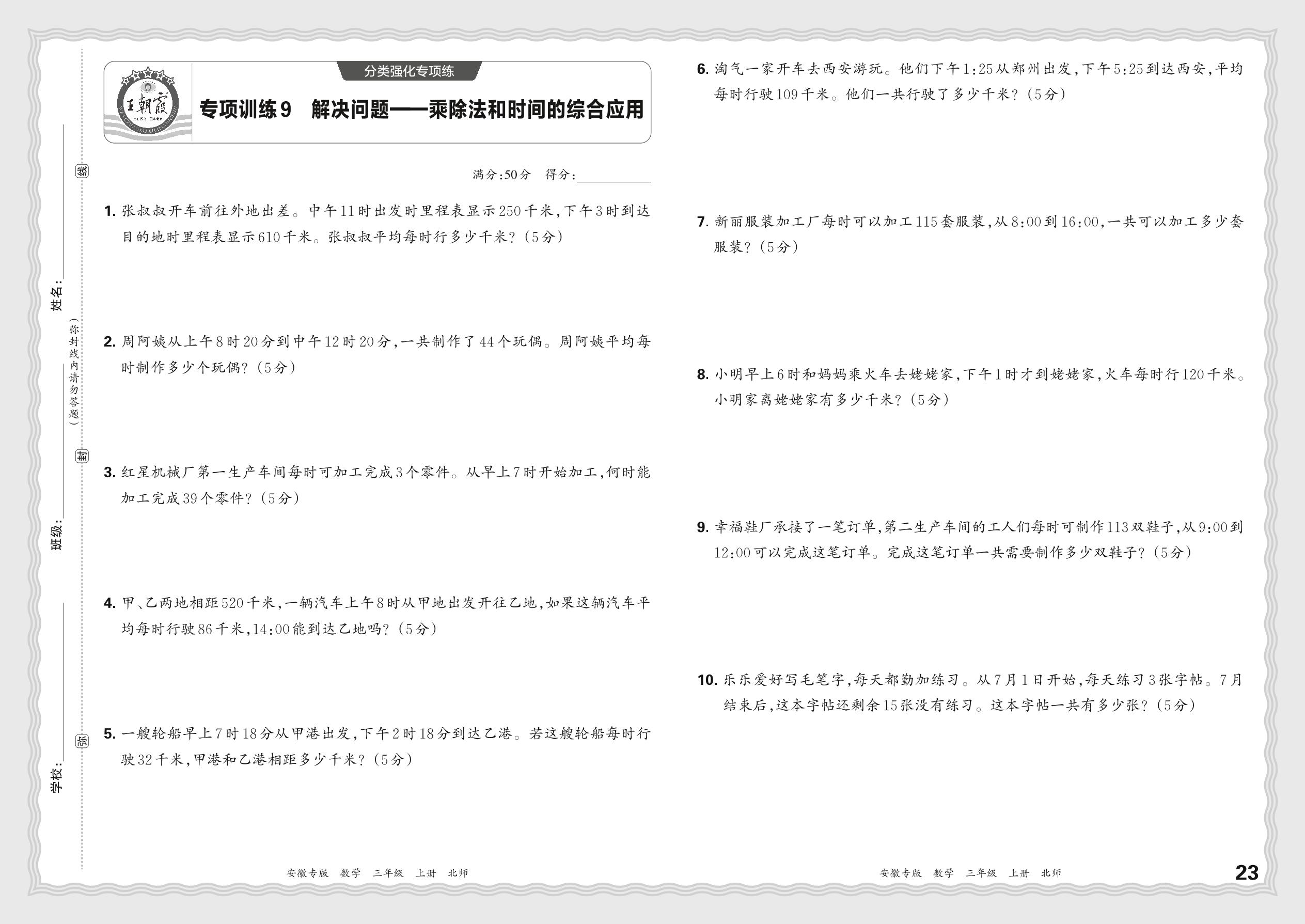 2023秋上册三年级数学北师版 期末专项·解决问题——乘除法和时间的综合应用【9】