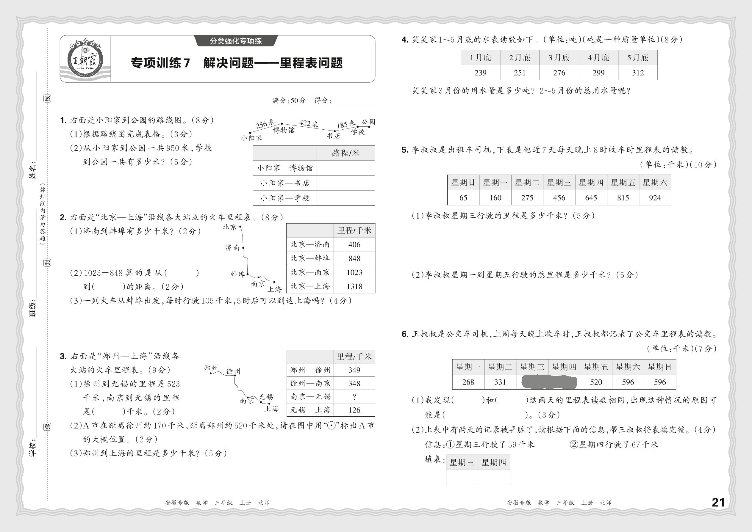 2023秋上册三年级数学北师版 期末专项·解决问题——里程表问题【7】