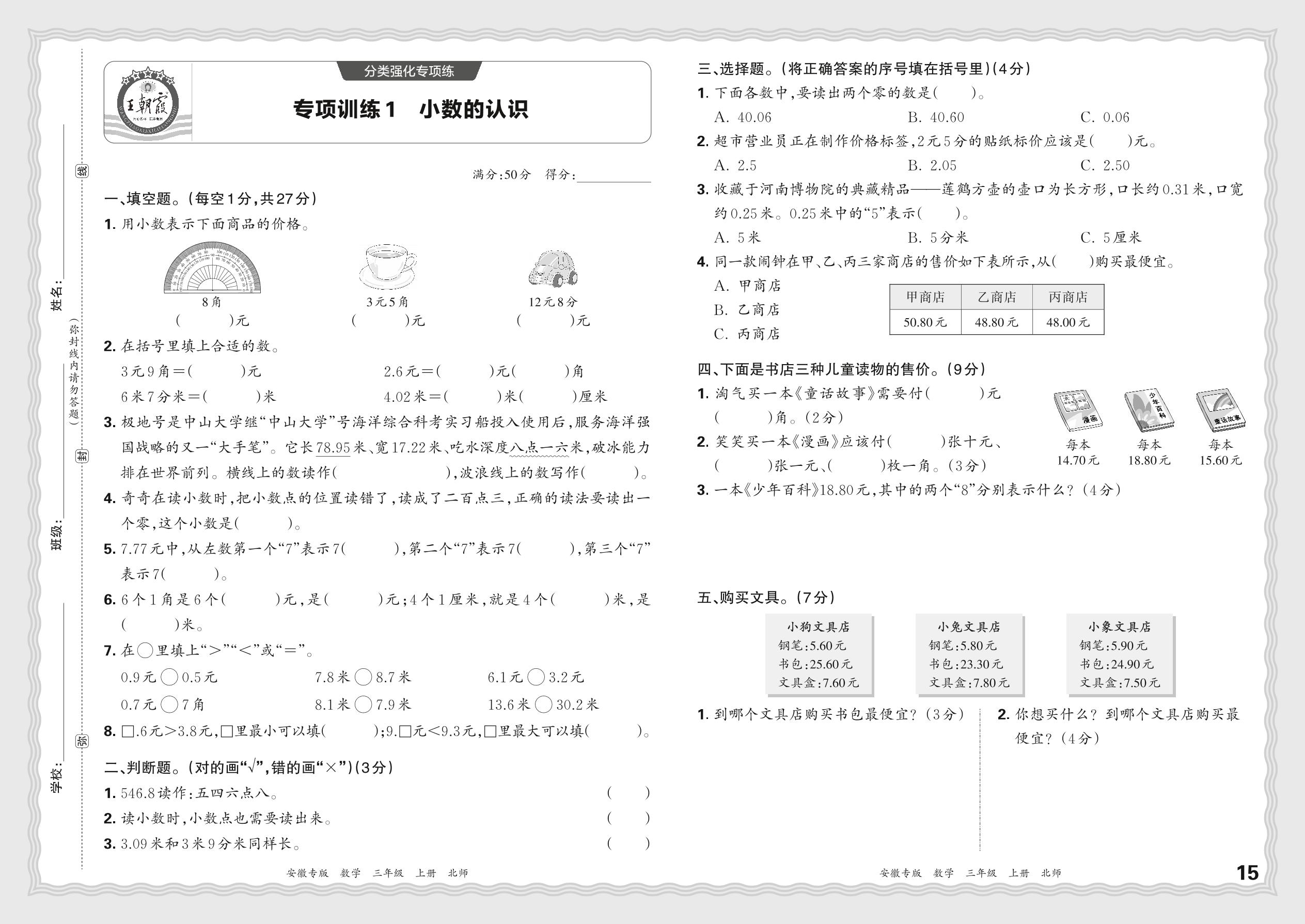 2023秋上册三年级数学北师版 期末专项·小数的认识【1】