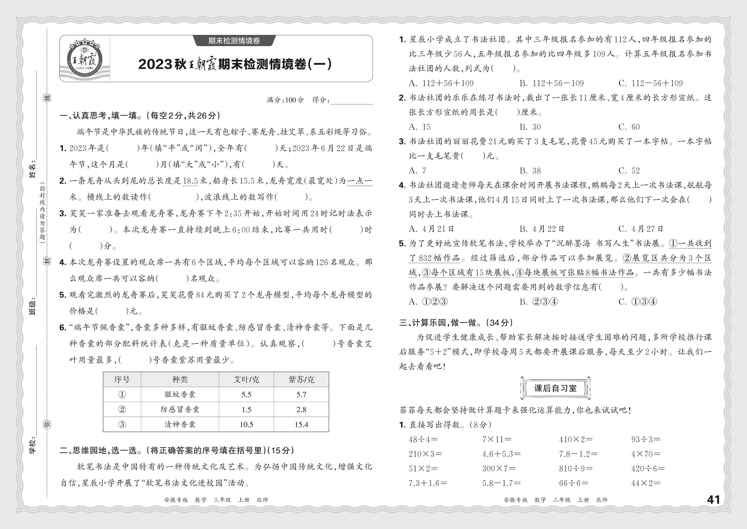 2023秋上册三年级数学北师版 王朝霞期末检测情境卷(一)