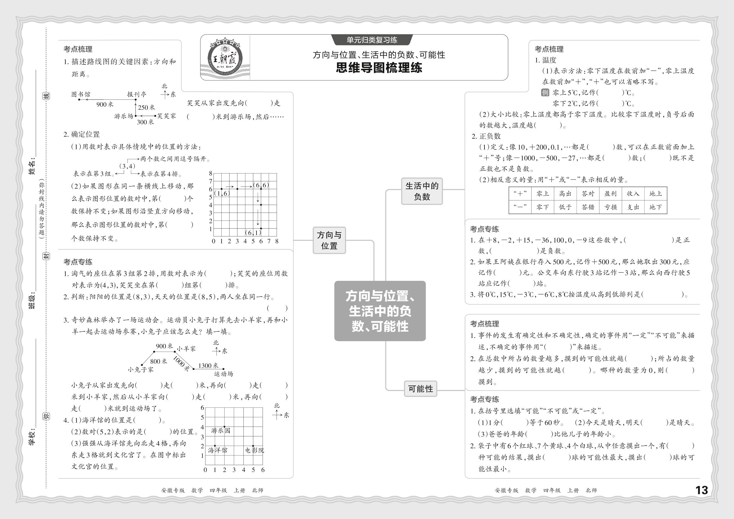 2023秋上册四年级数学北师版 期末过课本·单元归类复习练——方向与位置、生活中的负数、可能性【6】