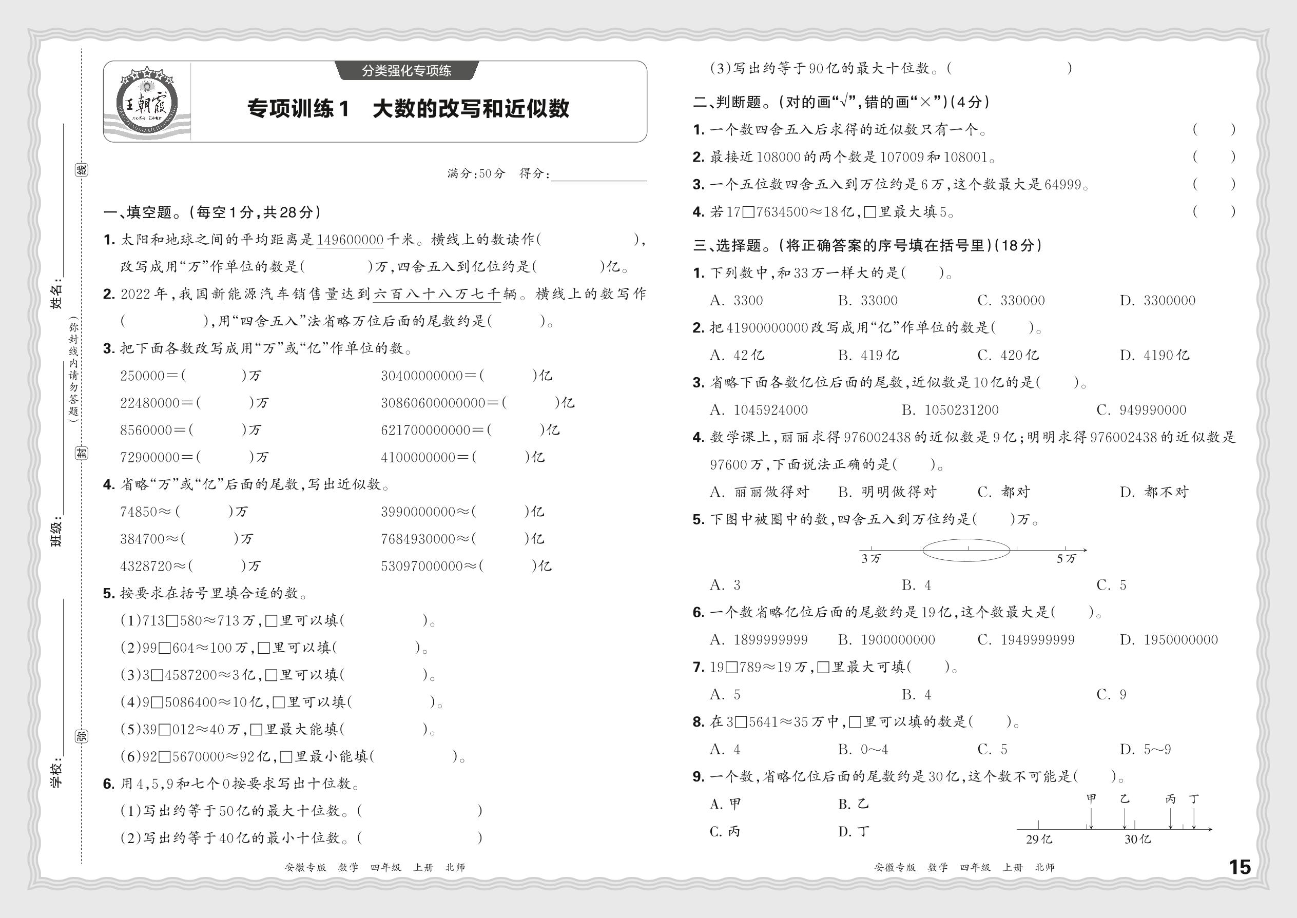 2023秋上册四年级数学北师版 期末专项·大数的改写和近似数【1】