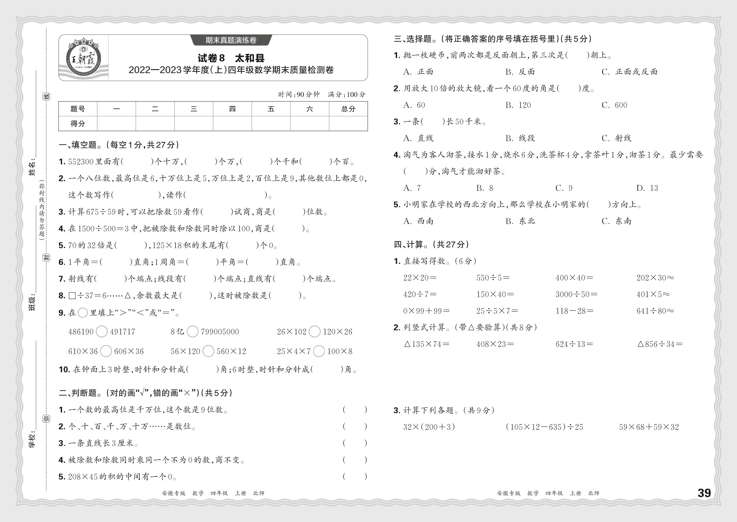 安徽省阜阳市太和县2022-2023学年度(上)四年级数学期末质量检测试卷(北师版)【8】