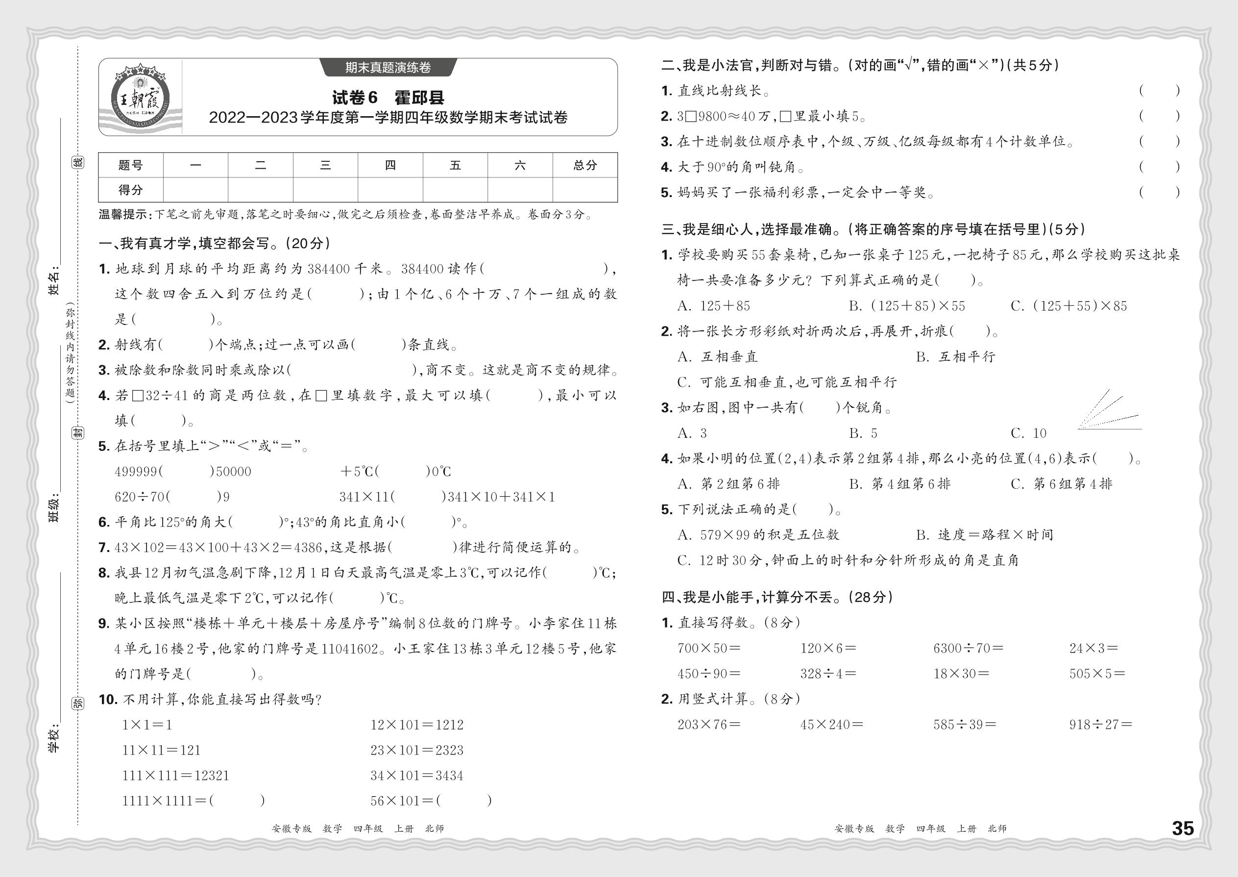 安徽省六安市霍邱县2022—2023学年度第一学期小学四年级数学期末考试试卷(北师版)【6】