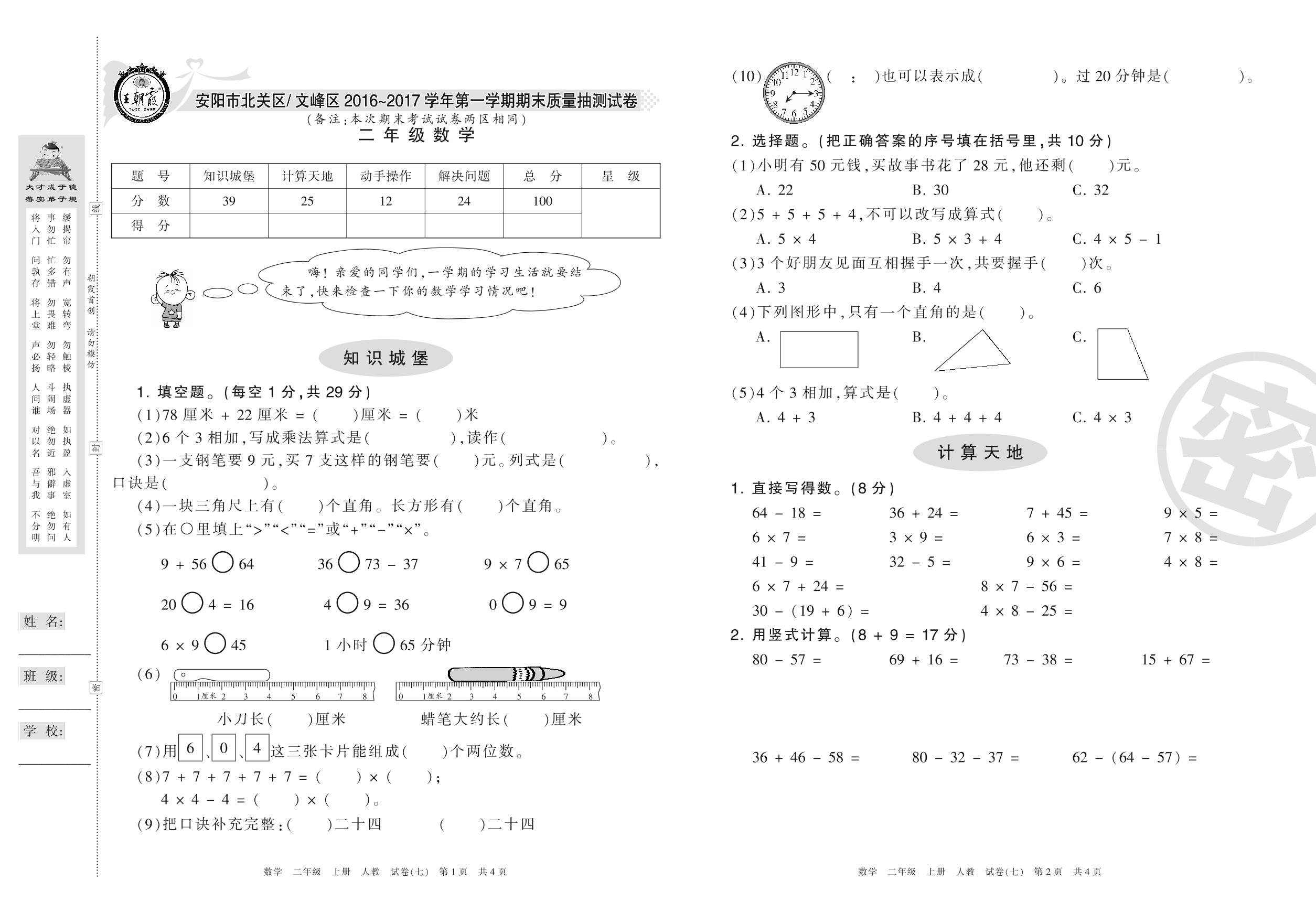 2016-2017学年第一学期安阳市北关区(文峰区)二年级数学试卷(人教版)【7】