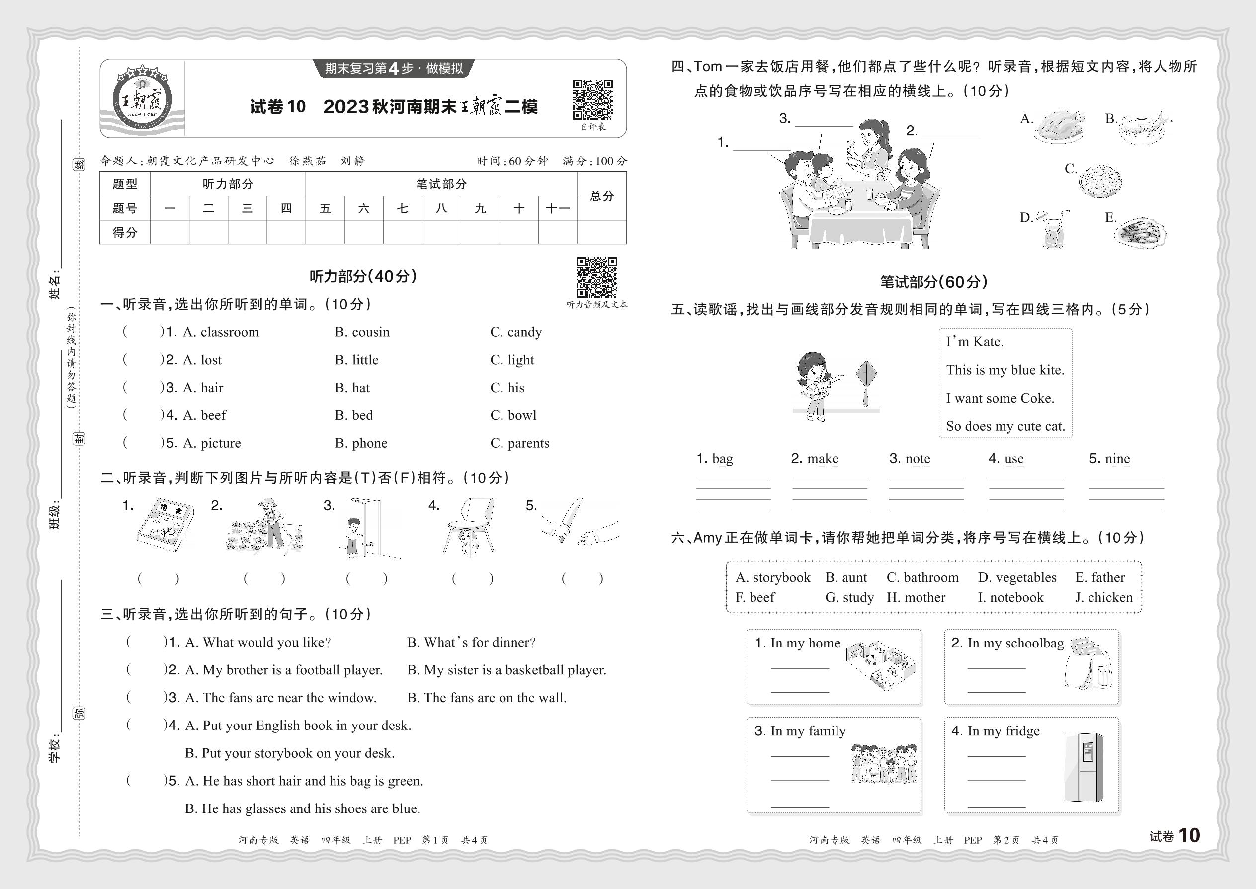 2023秋上册四年级英语人教PEP版 河南期末王朝霞二模【10】