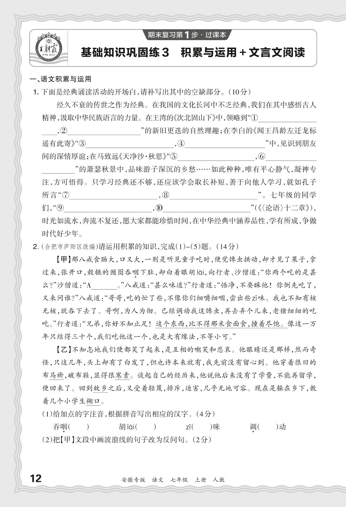 2023秋上册七年级语文人教版 期末过课本·基础知识巩固练 积累与运用+文言文阅读【3】