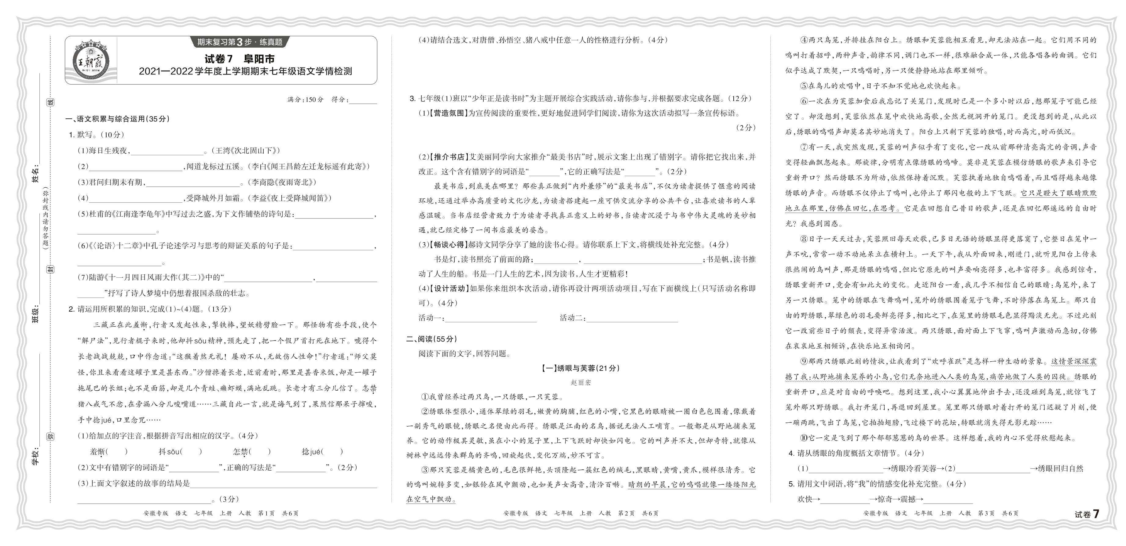 安徽省阜阳市2021—2022学年度上学期期末七年级语文学情检测(人教版)【7】