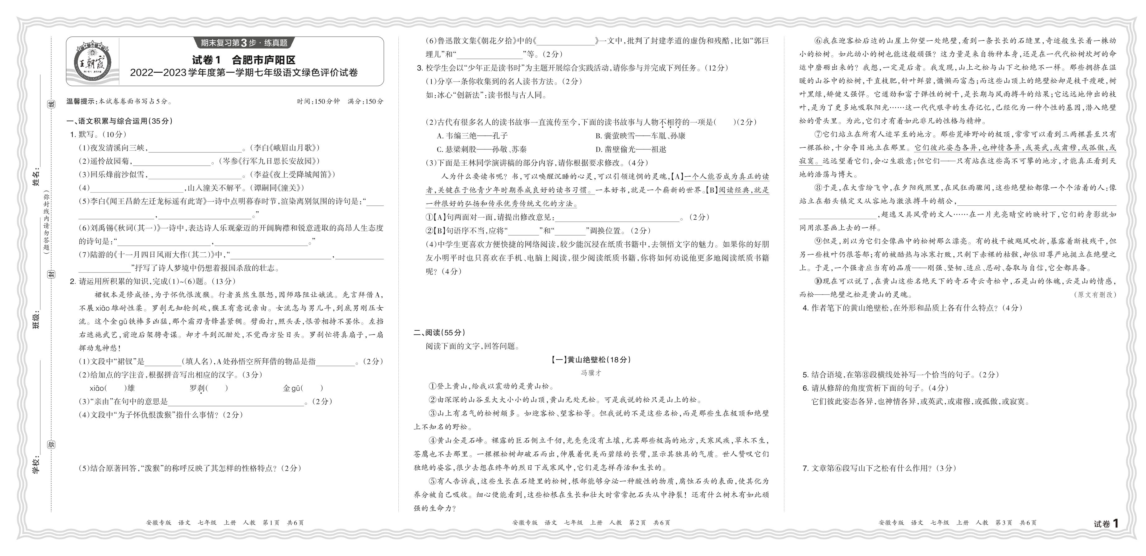安徽省合肥市庐阳区2022—2023学年度第一学期七年级语文绿色评价试卷(人教版)【1】