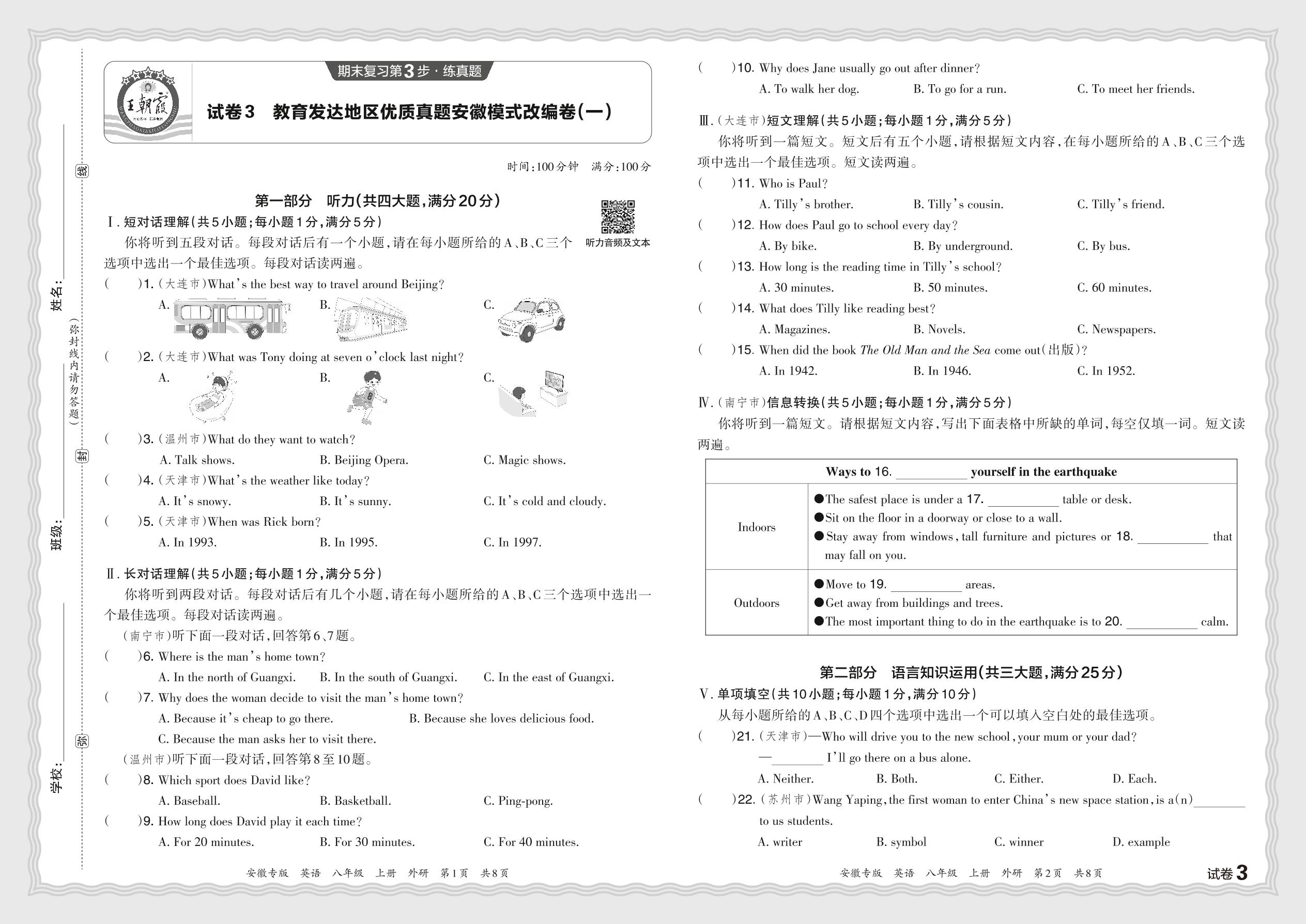 2023年秋教育发达地区优质真题安徽模式改编卷(一)八年级上册期末英语(外研版)【3】