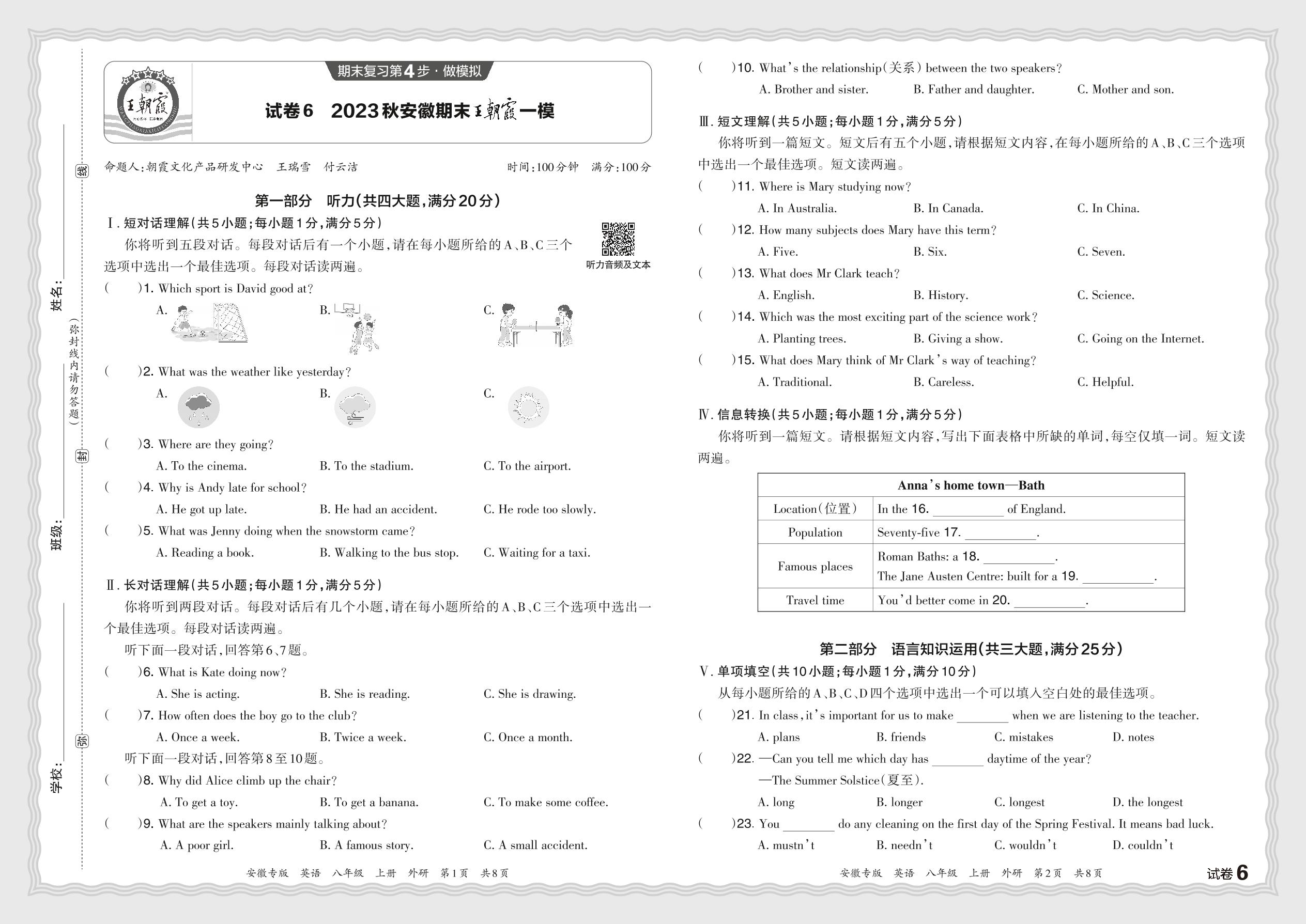 2023秋上册八年级英语外研版 安徽期末王朝霞一模