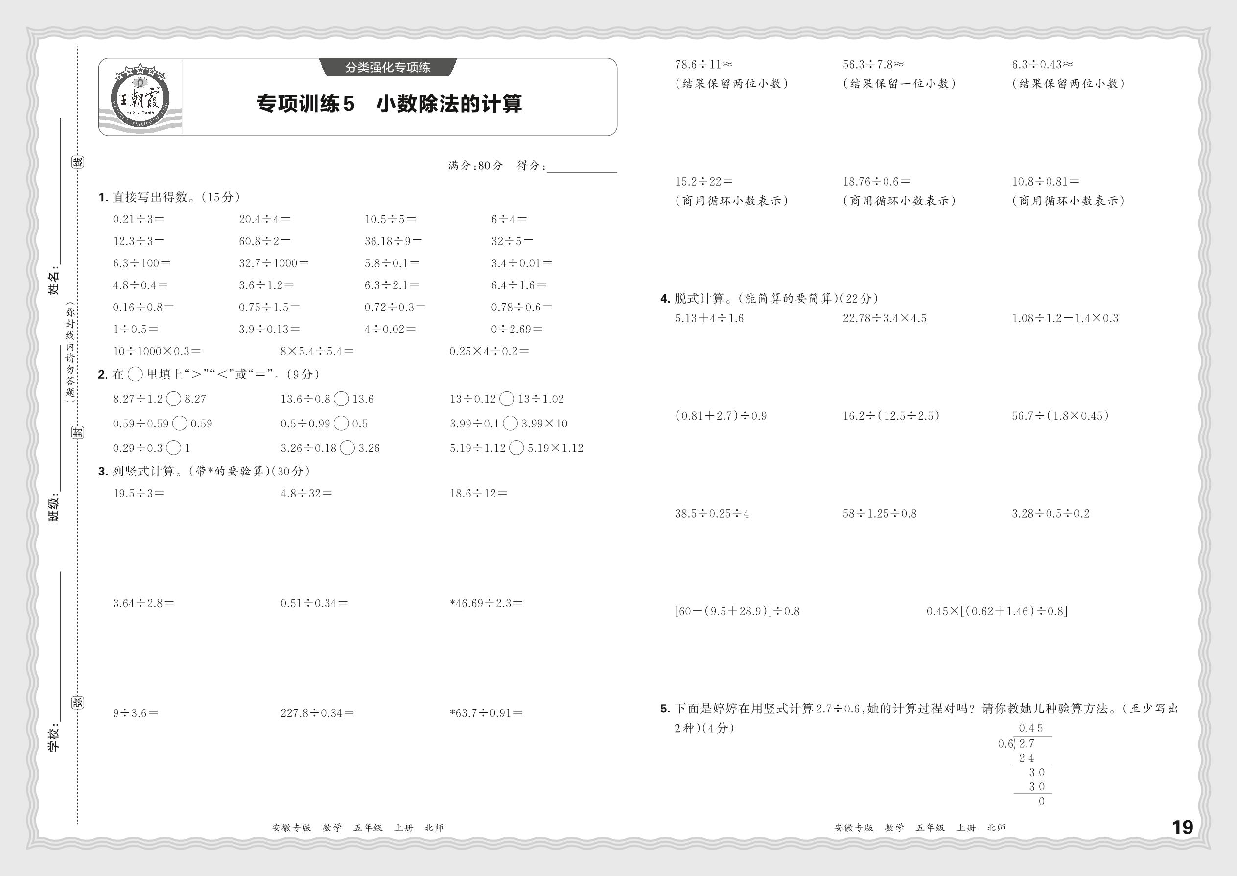 2023秋上册五年级数学北师版 期末专项·小数除法的计算【5】