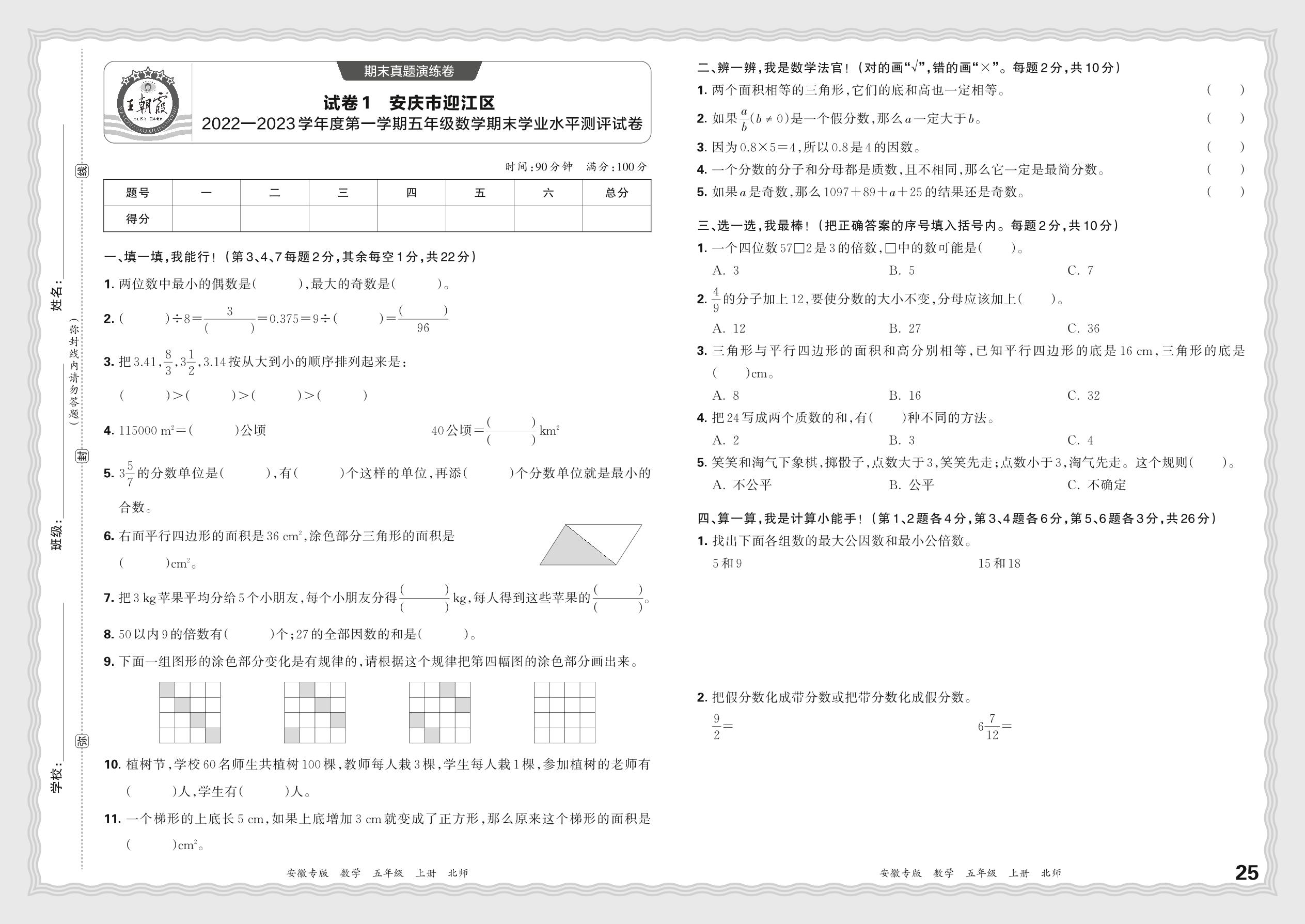 安徽省安庆市迎江区2022—2023学年度第一学期五年级数学期末学业水平测试卷(北师版)【1】