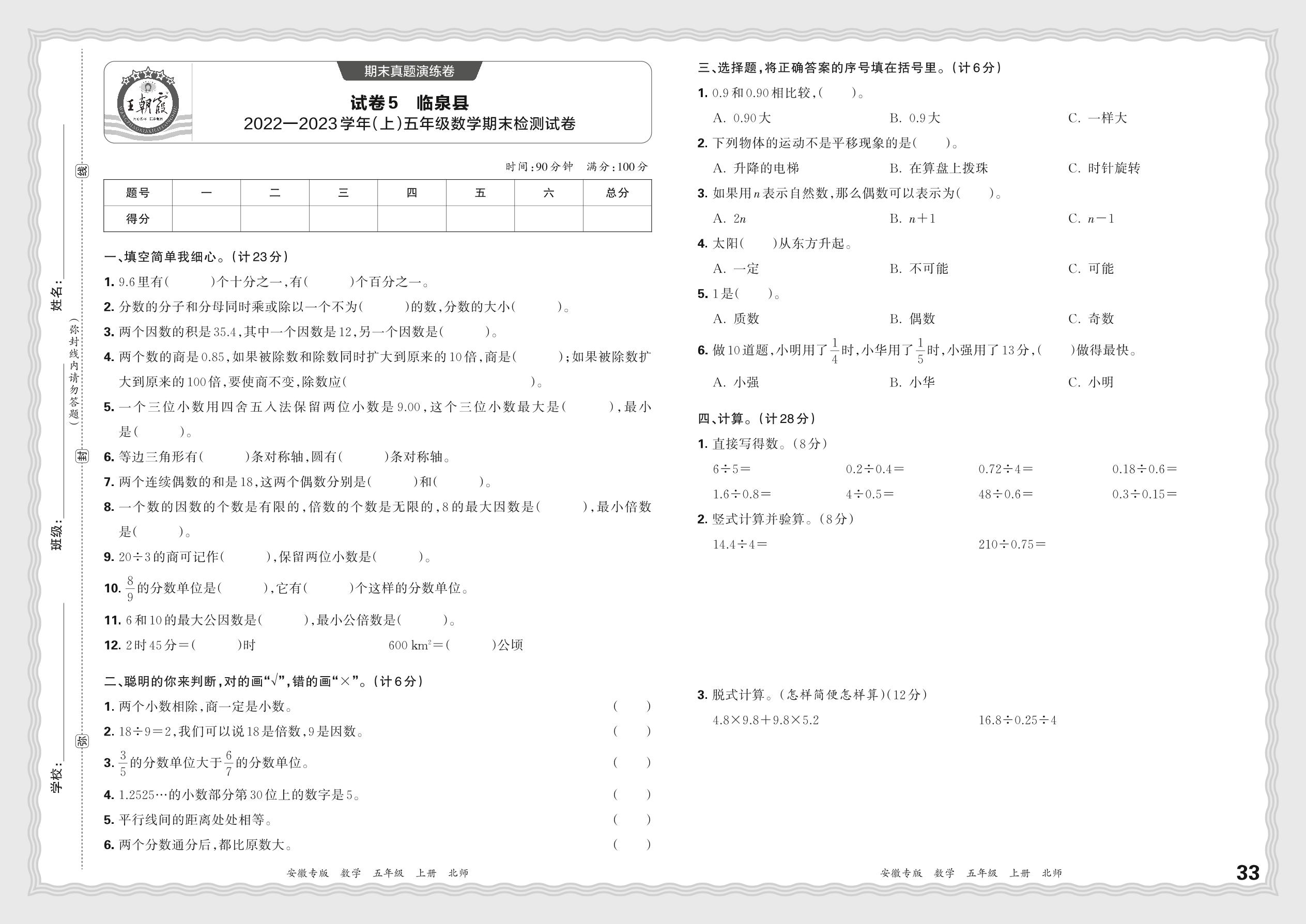 徽省阜阳市临泉县2022—2023学年(上)五年级数学期末检测试卷(北师版)【5】