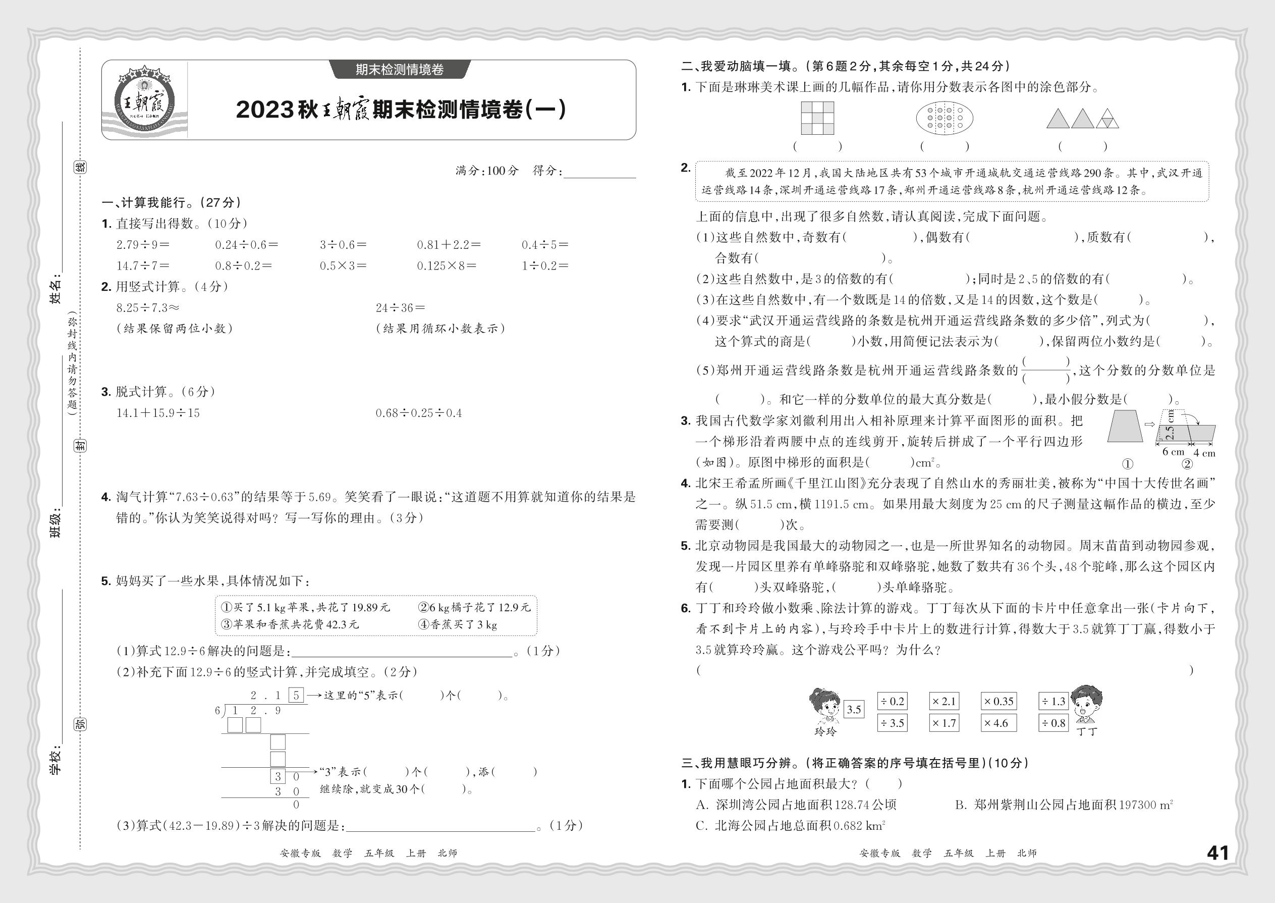 2023秋上册五年级数学北师版 王朝霞期末检测情境卷(一)