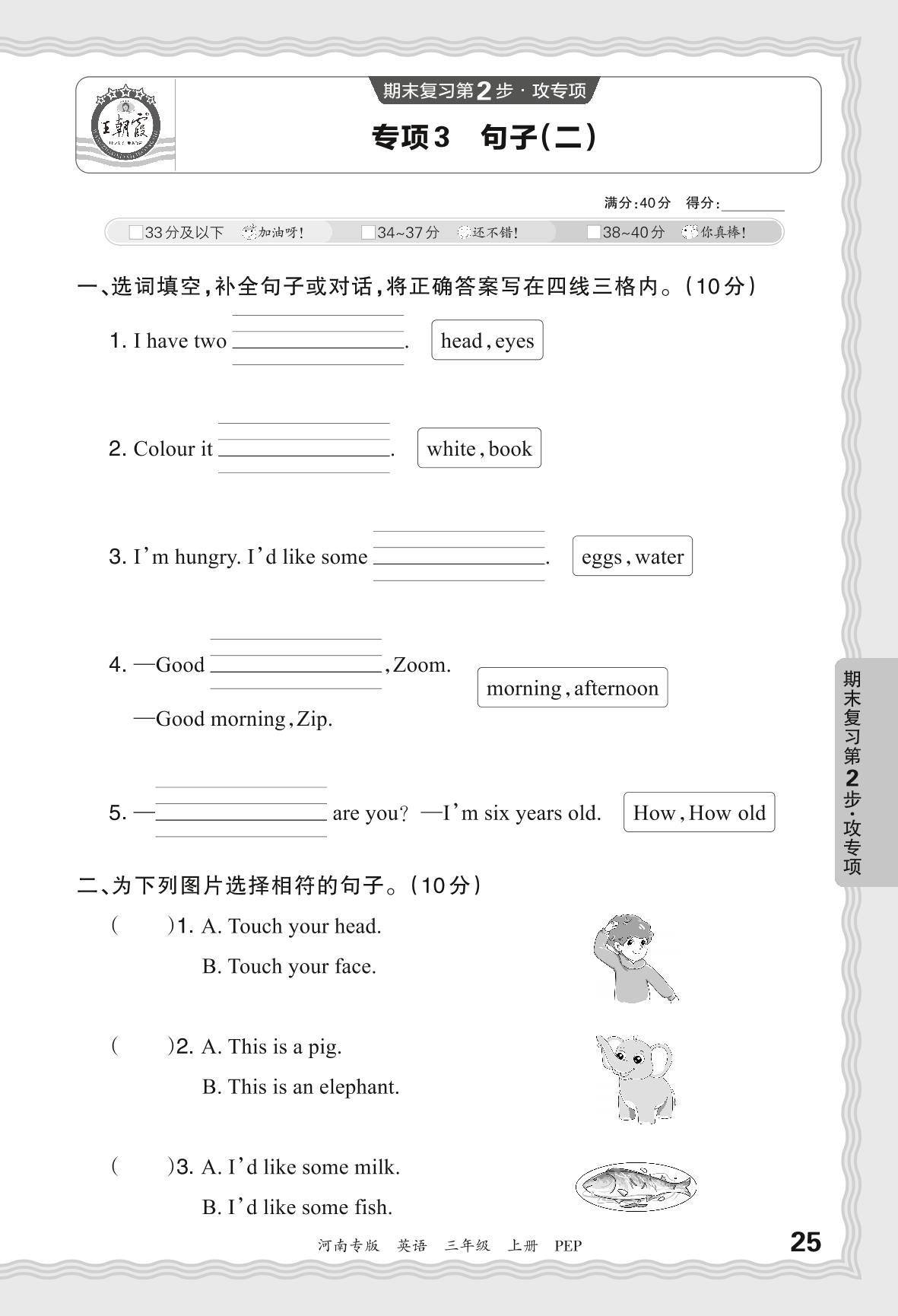 三年级英语人教PEP版(三起始)上册专项卷