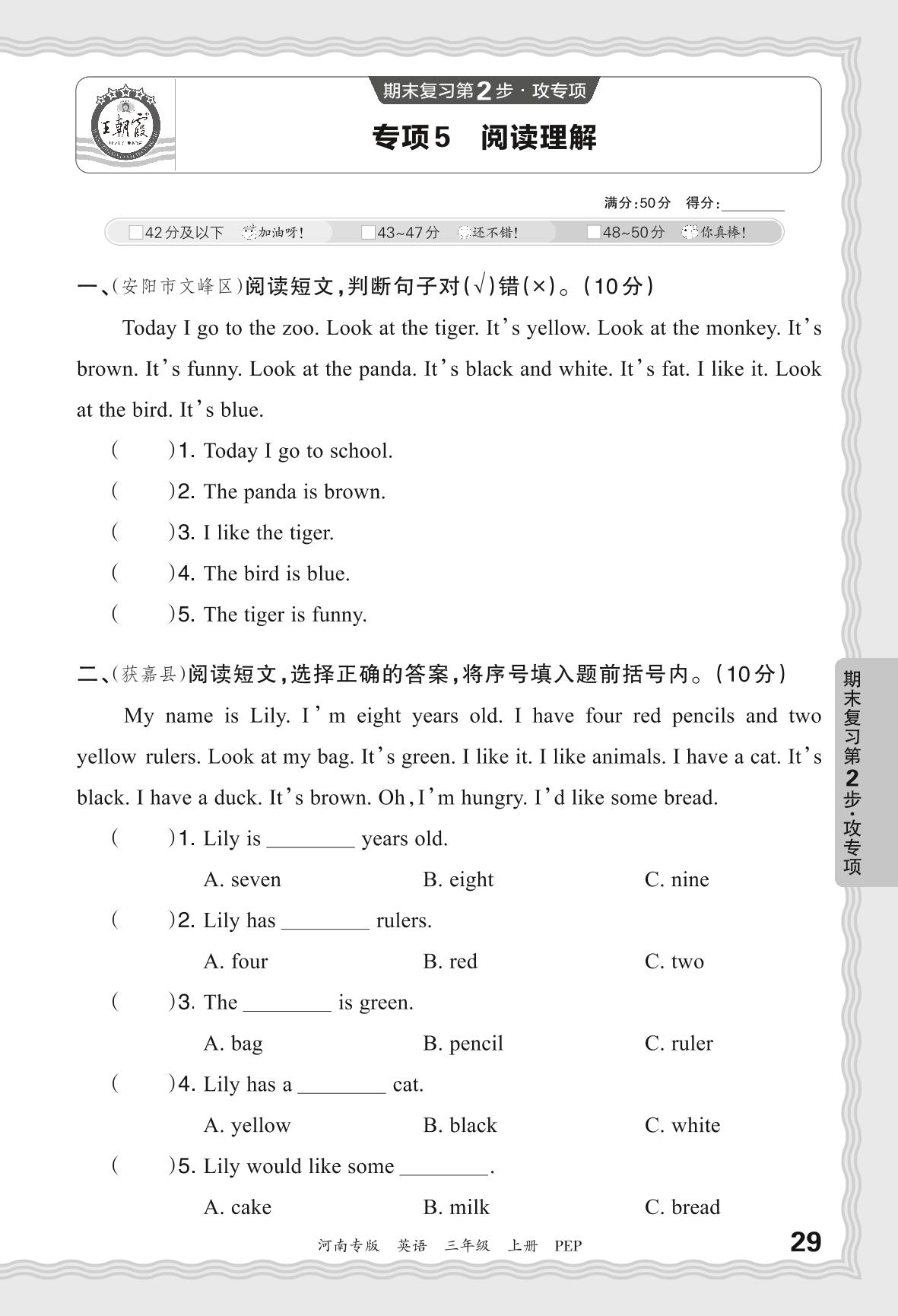 2023秋上册三年级英语人教PEP版 期末专项卷·阅读理解【5】